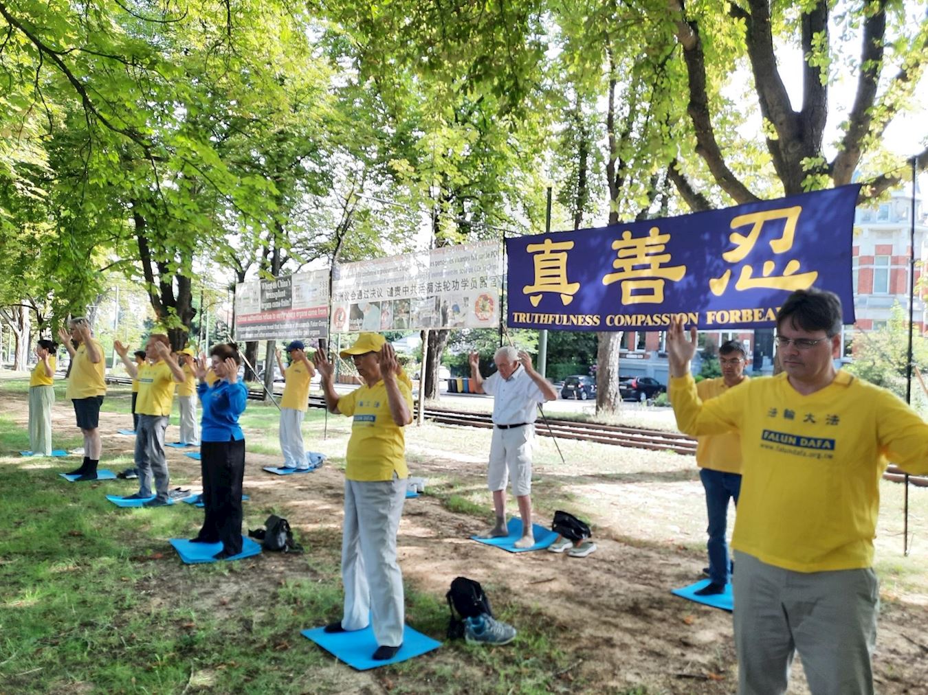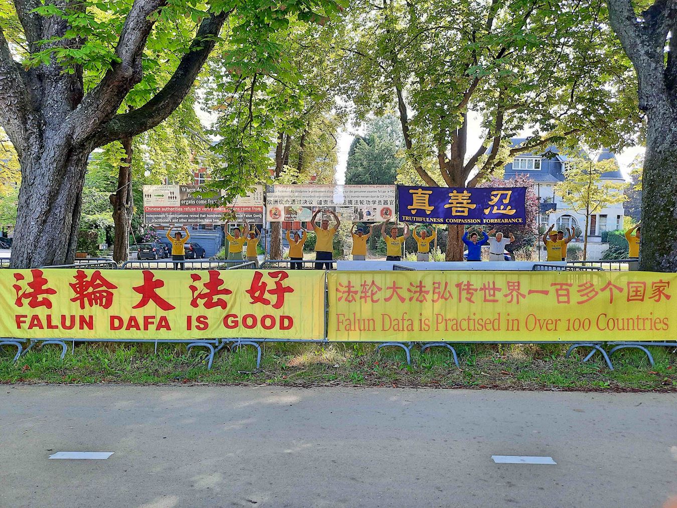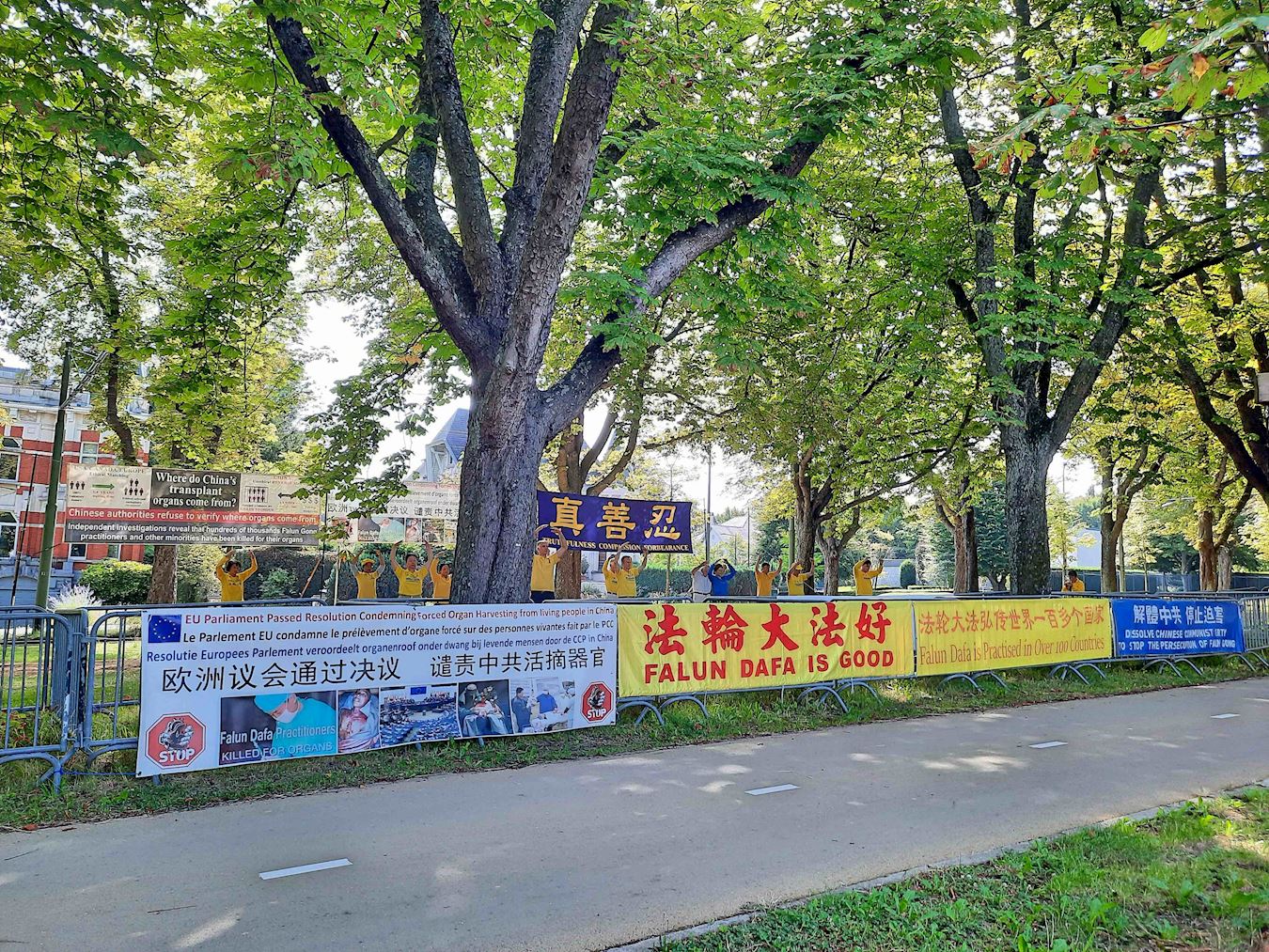 法轮功学员打出“中共迫害真善忍 天理不容”、“拯救善良 结束迫害”、“解体中共才能停止迫害”等大横幅,声援二十六年来面对迫害仍坚持信仰的中国大陆法轮功学员,同时有队伍拿着被迫害致死学员的照片,表达深切的悼念,并揭露中共各种迫害手段的残酷。