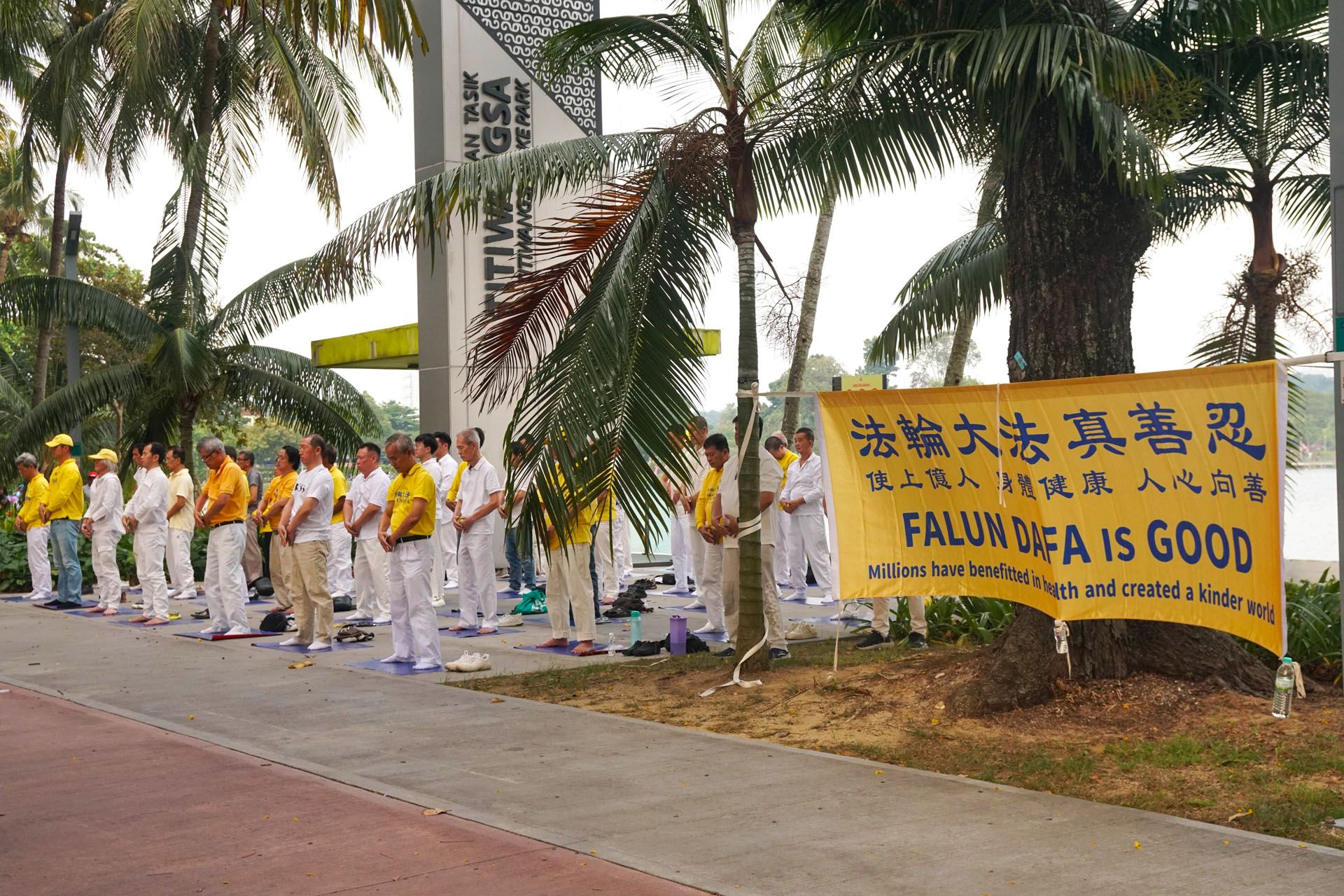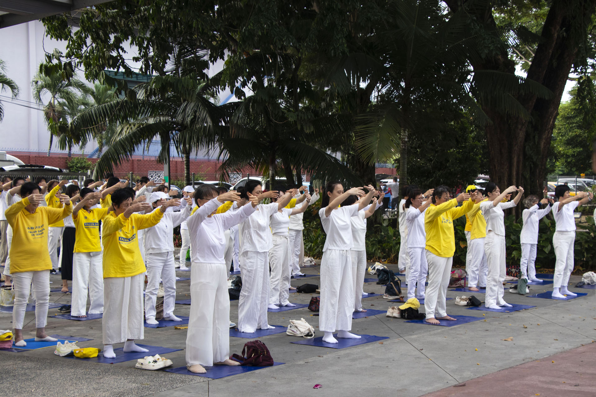 “在大雨中,他们还是很坚定。”张先生和夫人也在骑楼下躲雨,看到法轮功学员的队伍,让他深感佩服;尤其能坚持二十六年的和平反迫害,他表示“真的很少看到。”