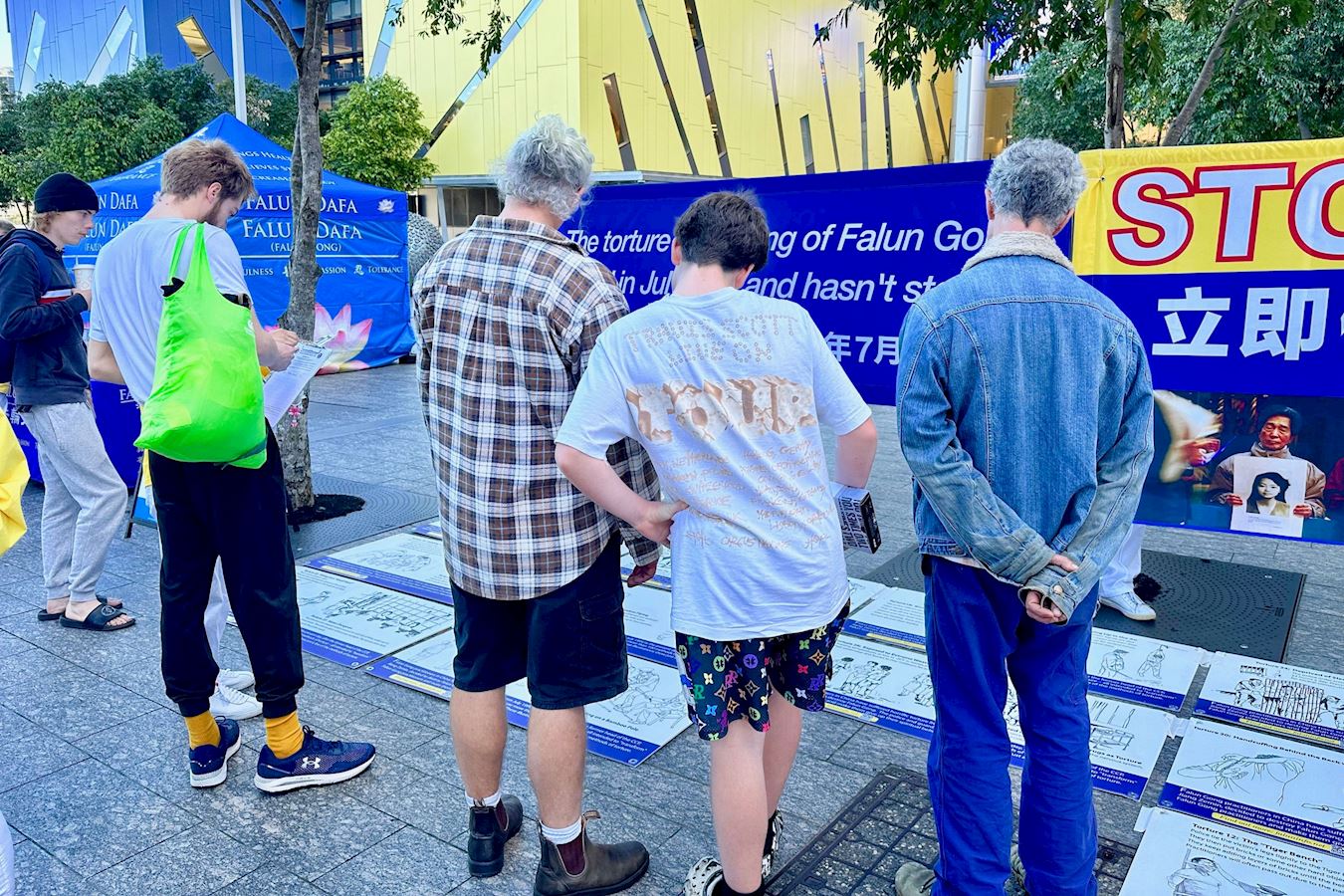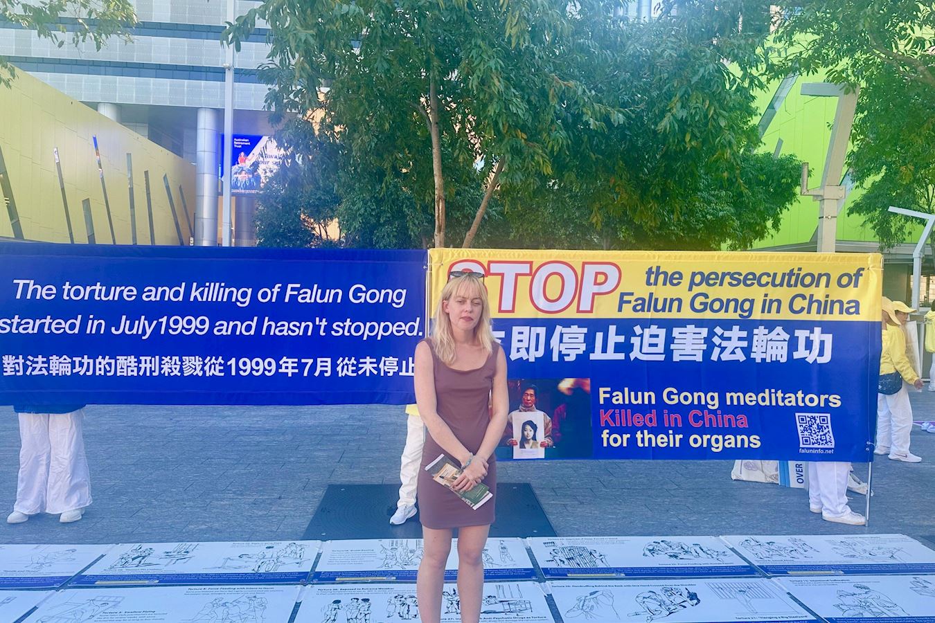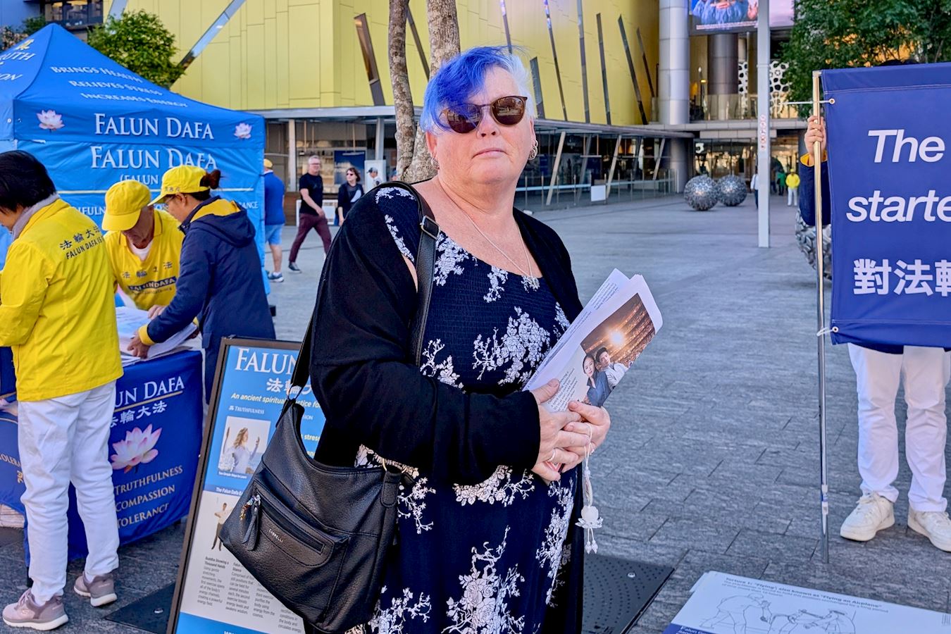 凯伦·唐纳森(Karen Donaldson)是退休的残疾护理员,她和朋友在布里斯班广场散步时,被学员平静的功法展示所吸引。走近后看到关于活摘器官和二十六年反迫害的横幅,感到触目惊心。