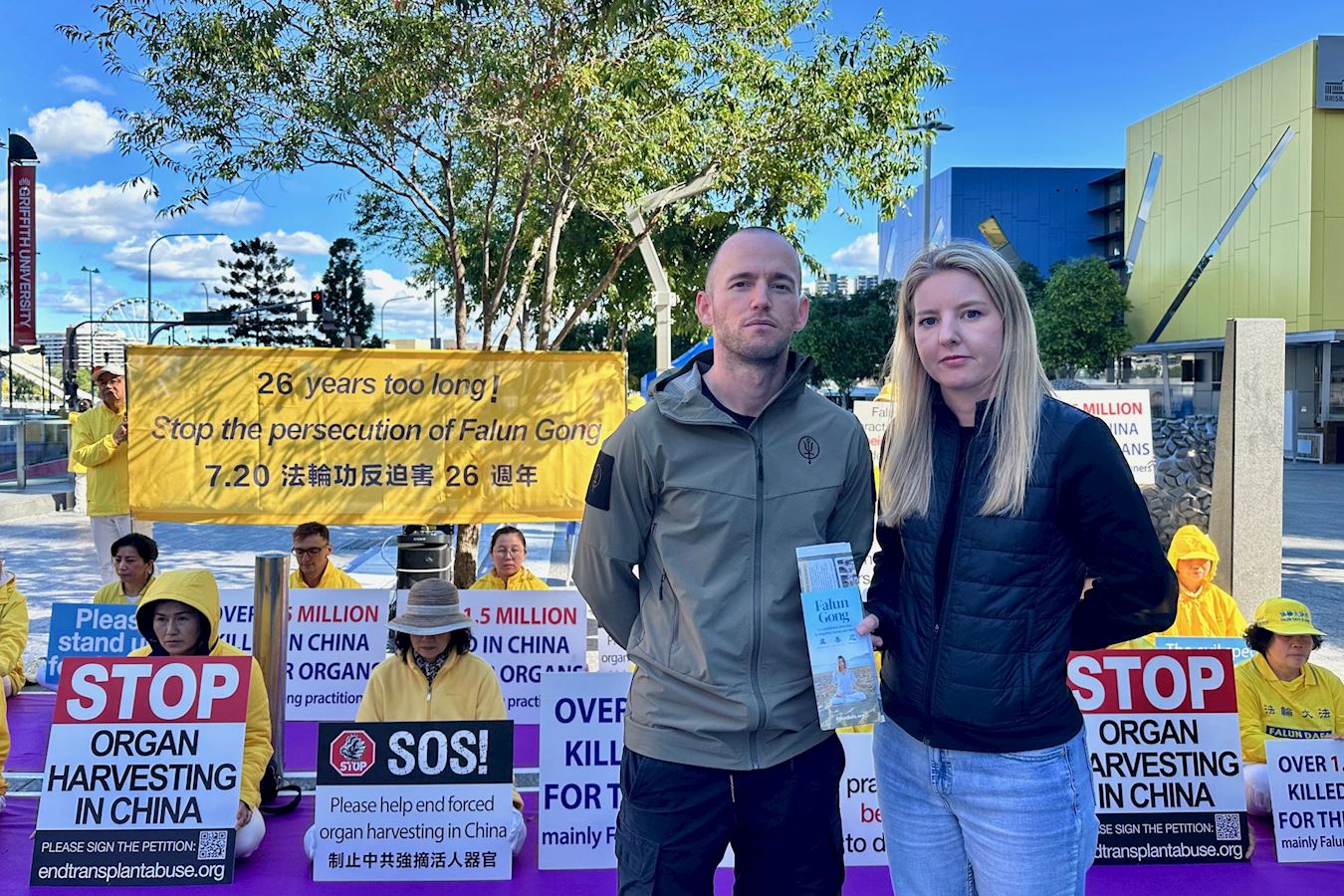 凯蒂(Katie)和丹尼(Danny)是来自昆士兰阳光海岸的一对情侣,他们是理疗医师。他们被排列整齐、举牌静坐的法轮功学员所吸引,来到真相展位前了解真相。