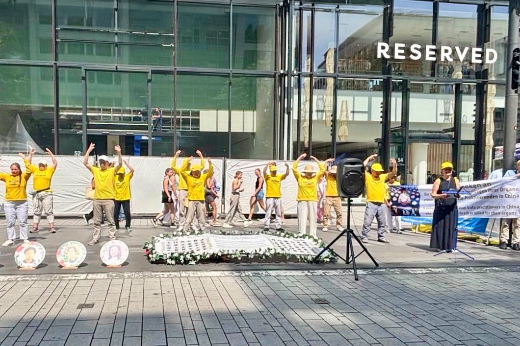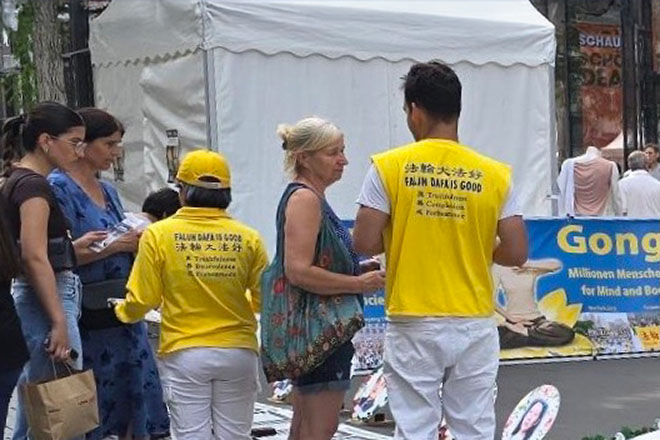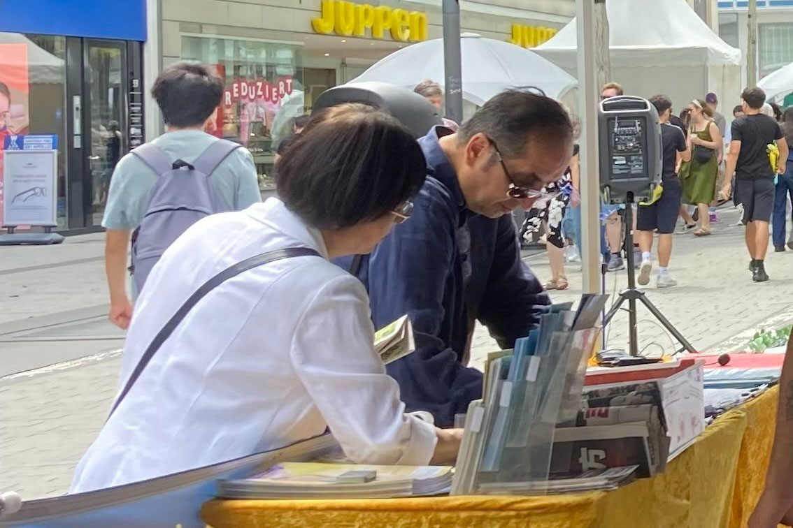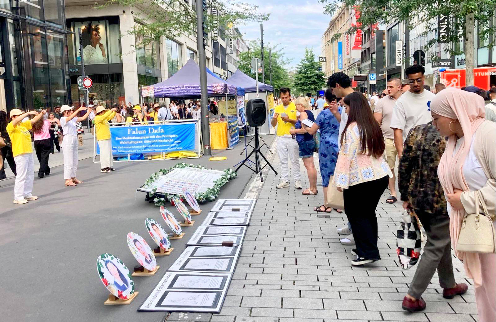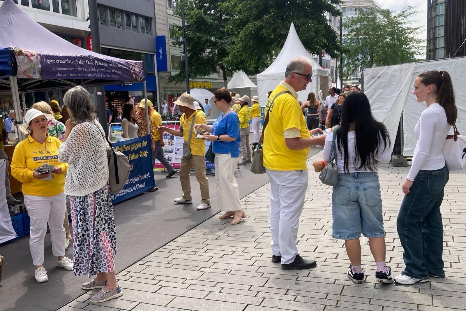 杜塞尔多夫市是德国西部最繁华的商业城之一。法轮功学员在市中心最繁华地带举行集会。集会上,学员宣读了多位北威州联邦议员和州议员的支持信,医生反活摘组织代表韦伯先生(Andreas Weber)也到场声援。此外,学员还集体炼功展示法轮功功法,和民众交谈,揭露中共在过去二十六年的迫害中种种恶毒行径,引起民众关注,纷纷签名声援法轮功学员反迫害。