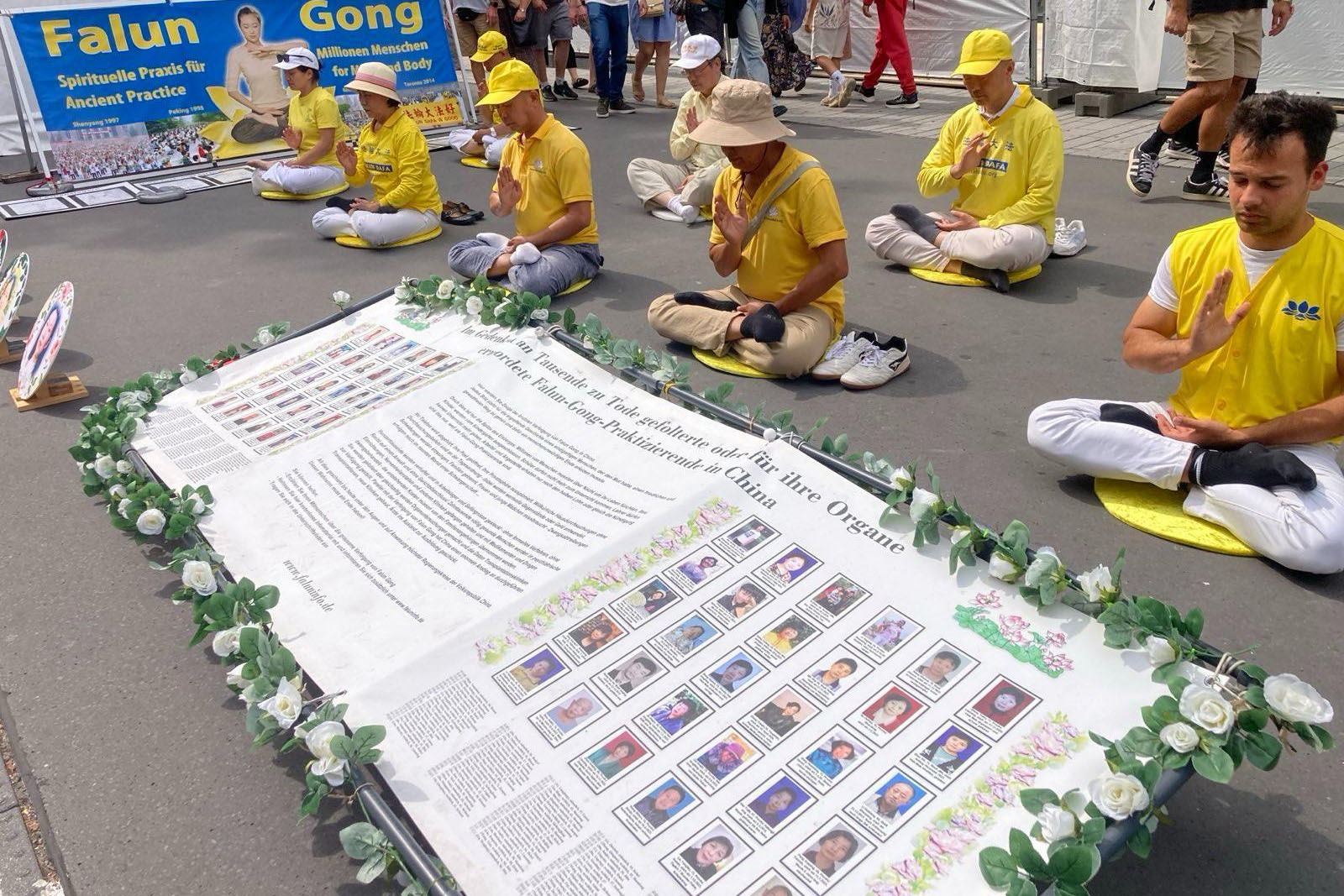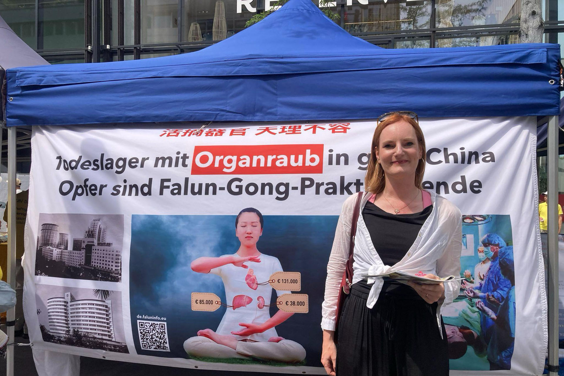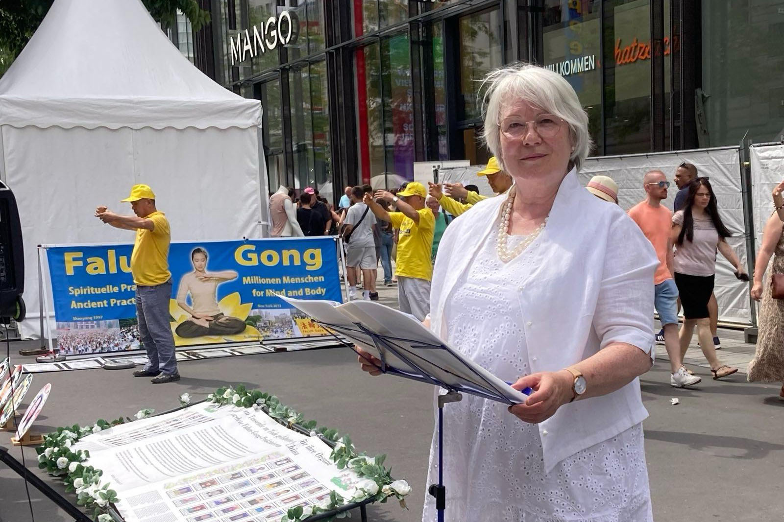 学员代表希弗尔女士(Eva-Marie Schiffe)在集会中发言,向民众讲述中共是如何在过去的二十六年持续制造传播仇恨,断绝法轮功学员的生活来源,连坐家属和同事,如何通过令人发指的酷刑和惨无人道的活摘器官进行种族灭绝等罪行。
