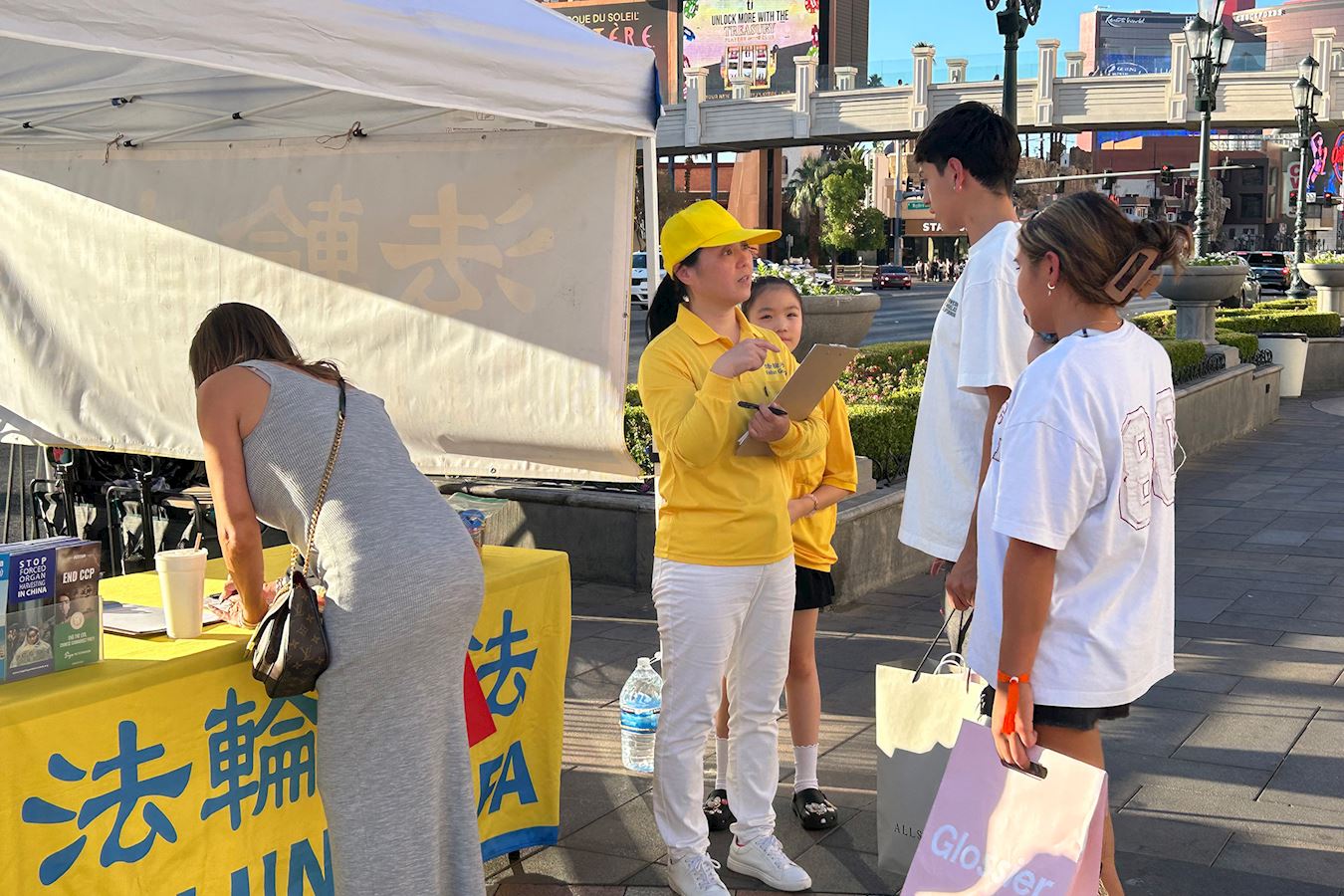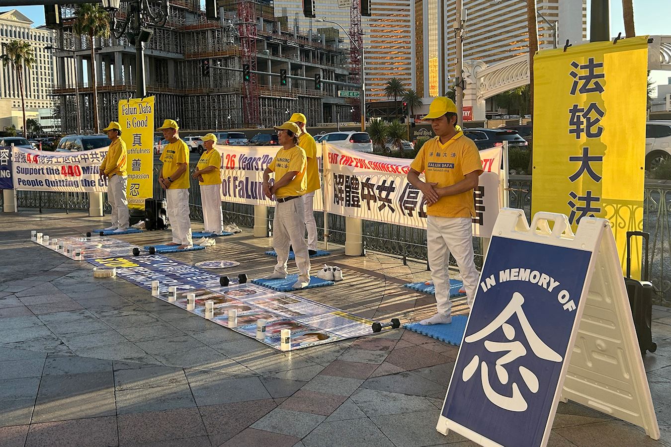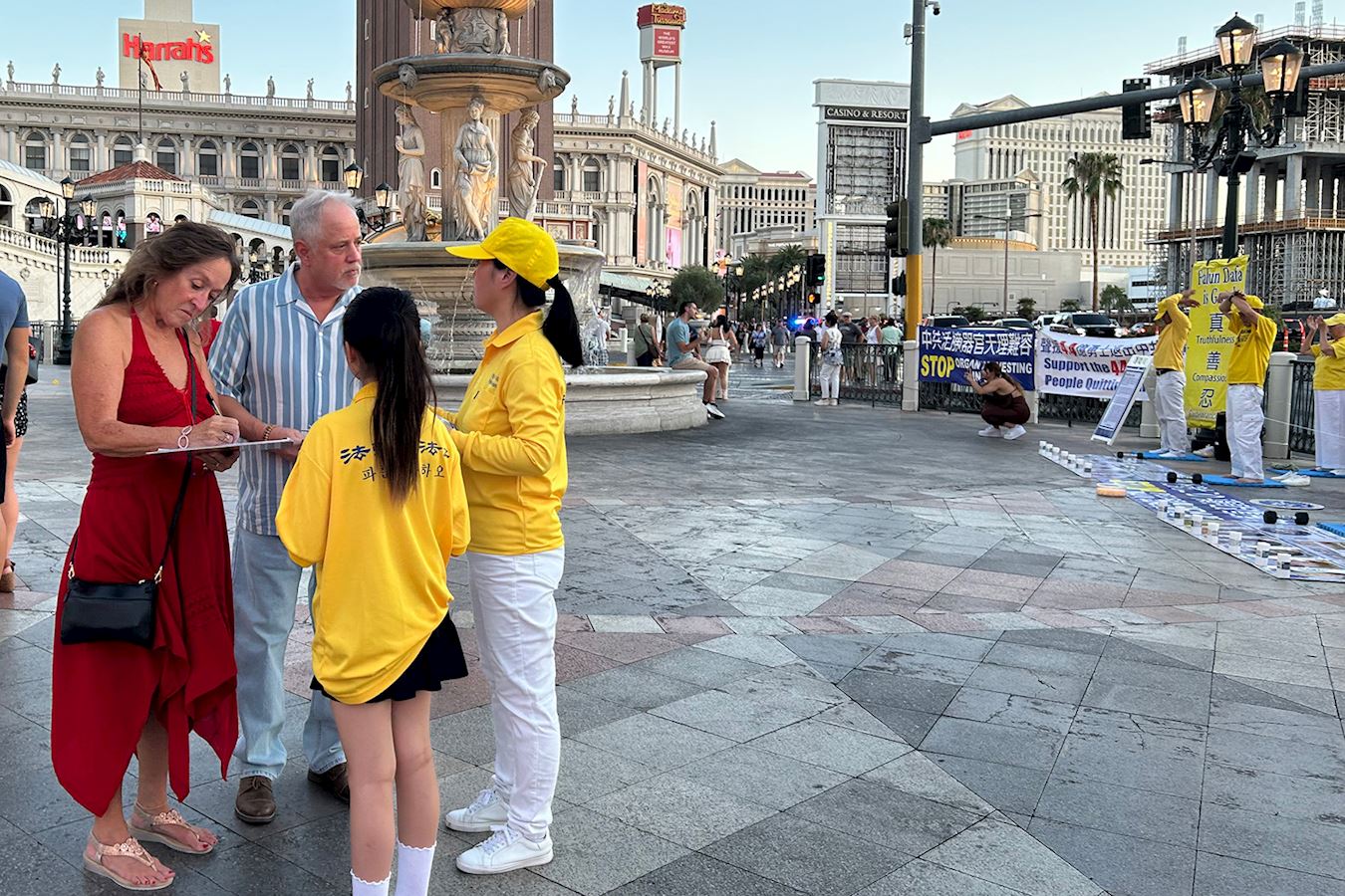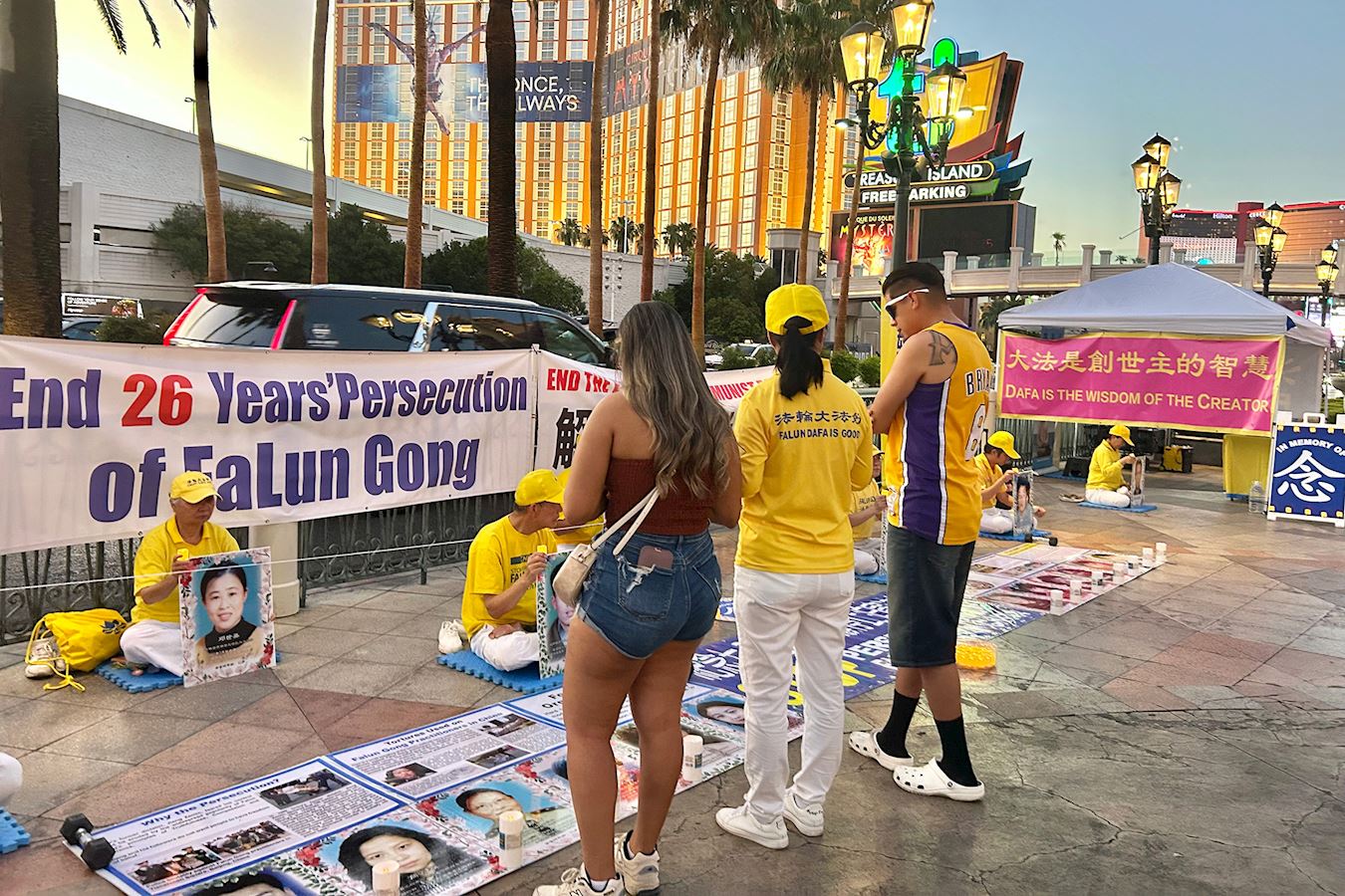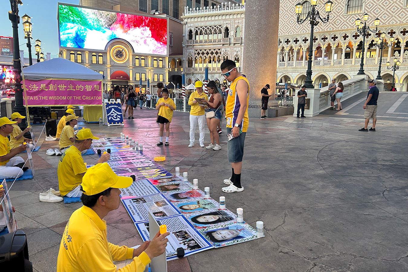 赌城的夏季炎热异常,即使到了傍晚时分也有华氏100度(近38摄氏度)。但赌场大道上仍然是人群密集、往来穿梭不息。法轮功学员顶着盛夏的酷暑在大道的一侧搭起了帐篷,架起了真相展板,展开醒目的条幅,功法展示、烛光夜悼、发放真相资料及征集反迫害签名活动。