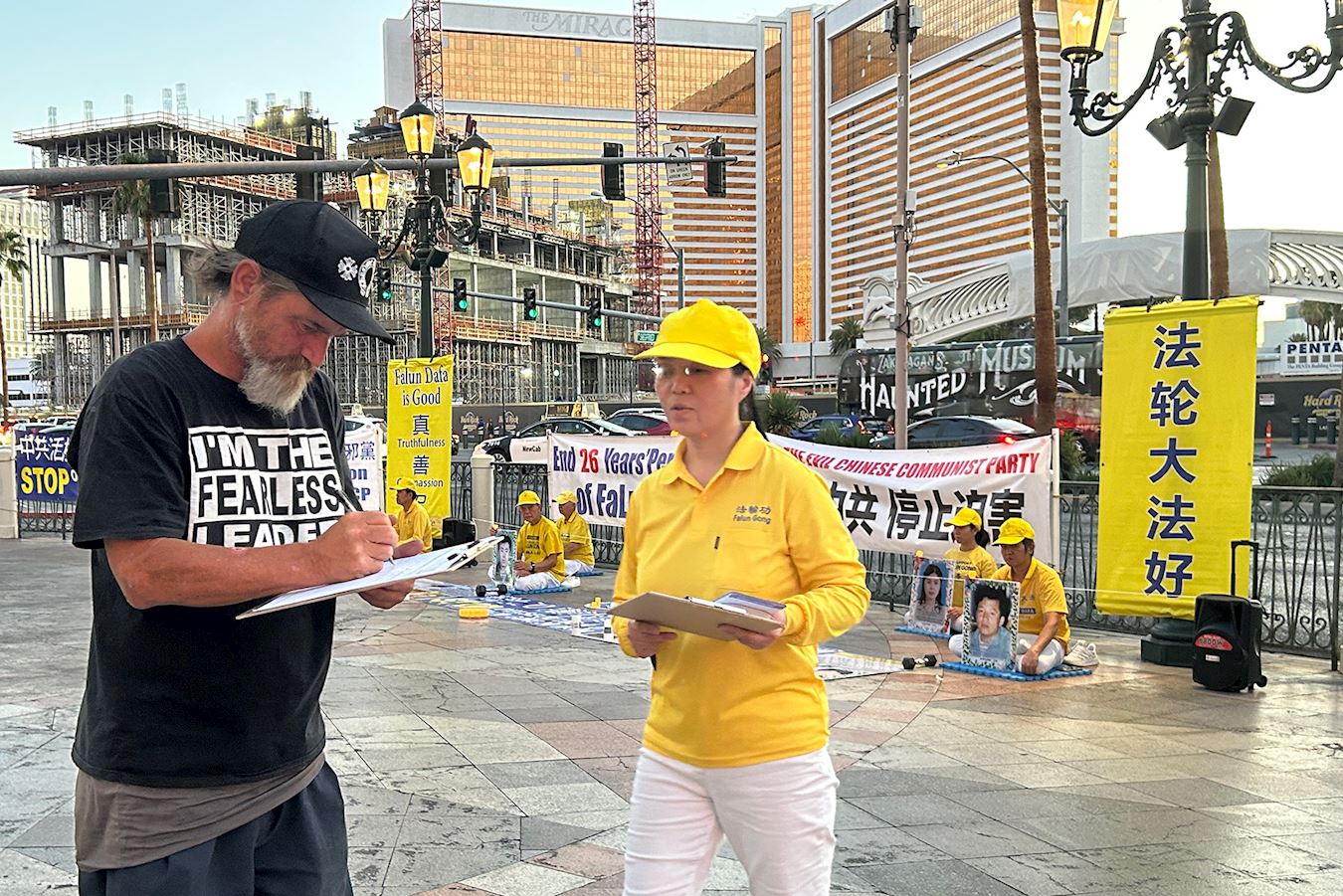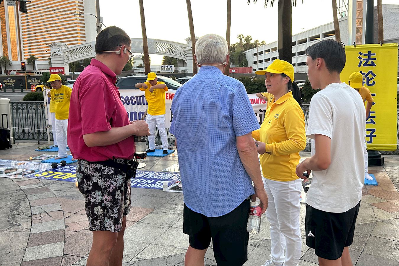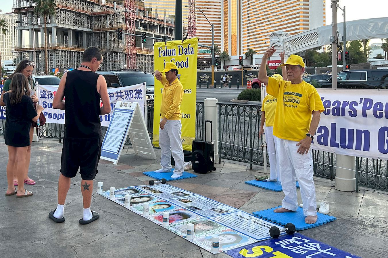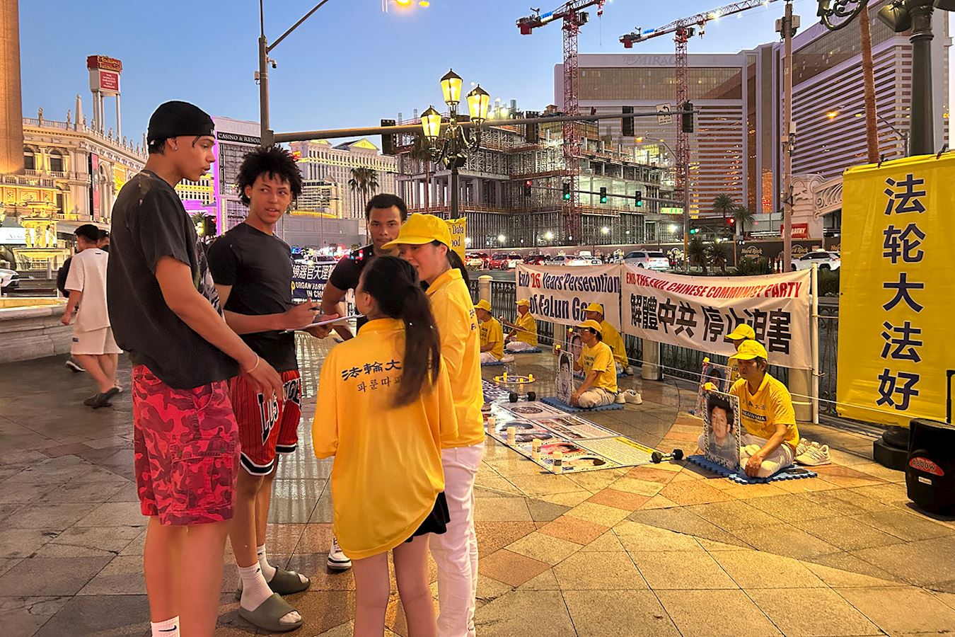 赌城的夏季炎热异常,即使到了傍晚时分也有华氏100度(近38摄氏度)。但赌场大道上仍然是人群密集、往来穿梭不息。法轮功学员顶着盛夏的酷暑在大道的一侧搭起了帐篷,架起了真相展板,展开醒目的条幅,功法展示、烛光夜悼、发放真相资料及征集反迫害签名活动。