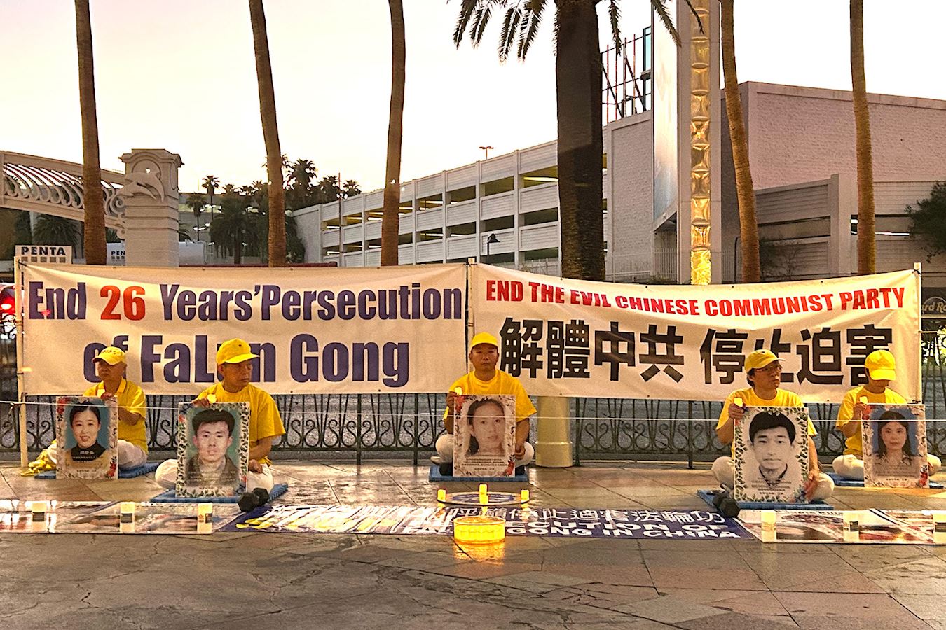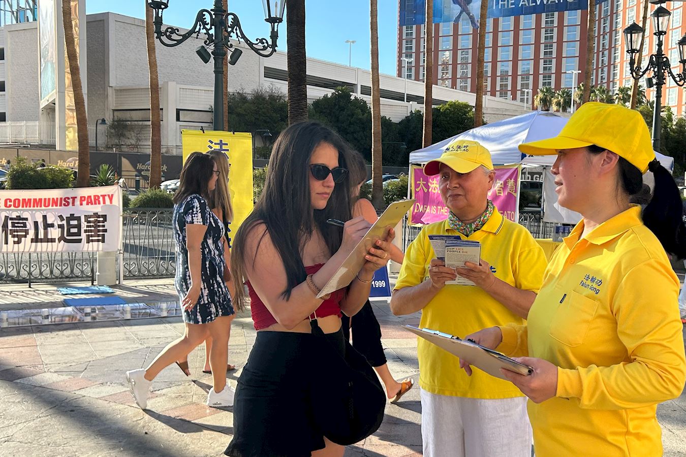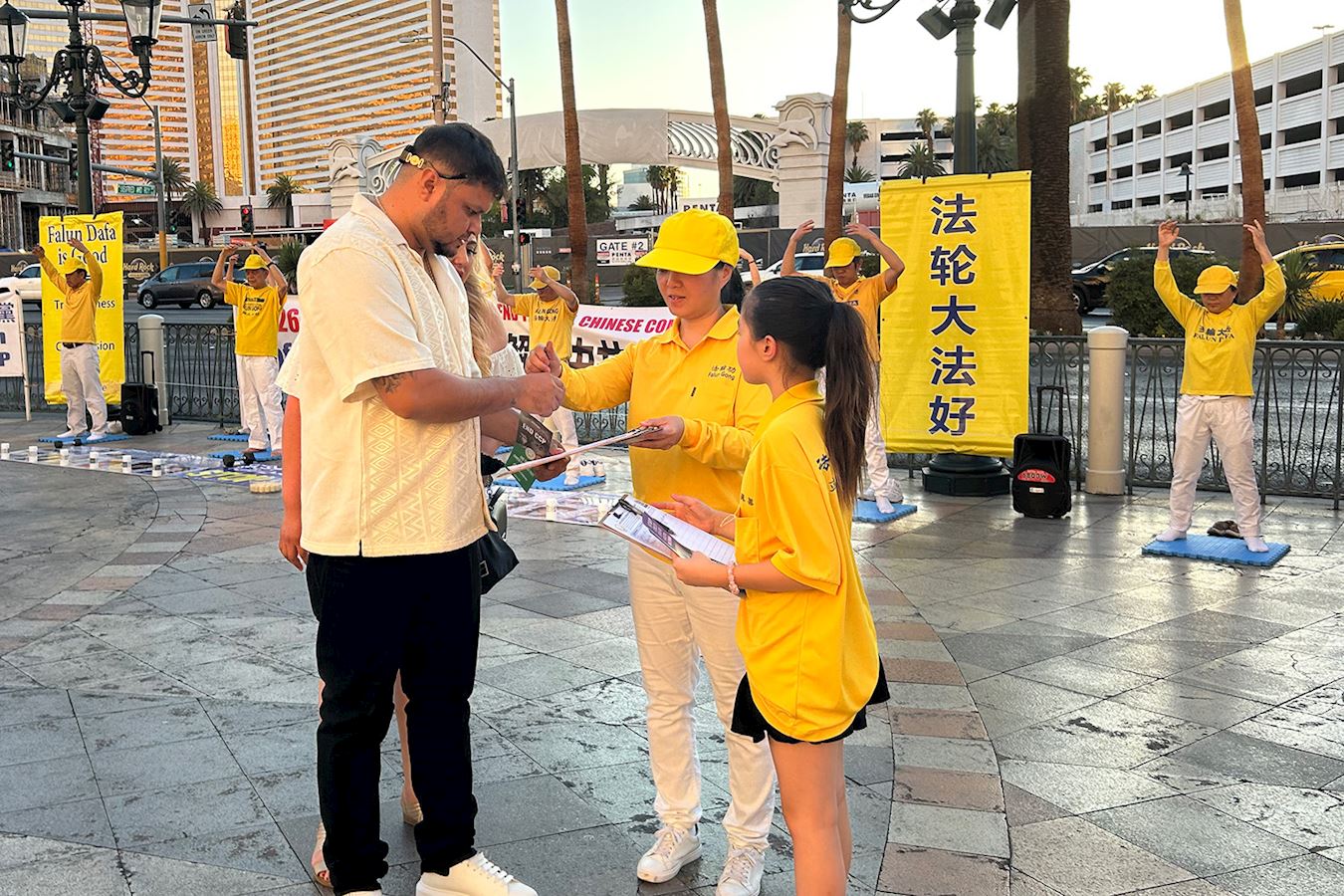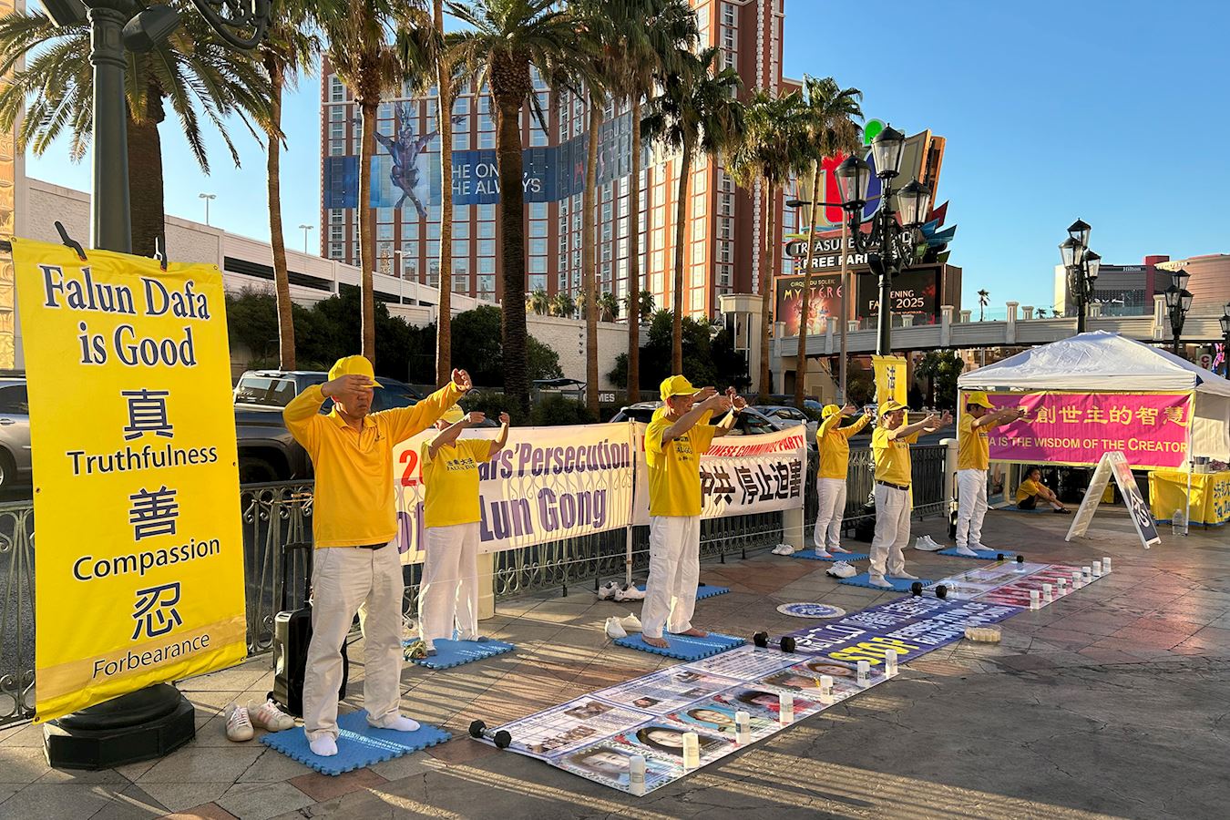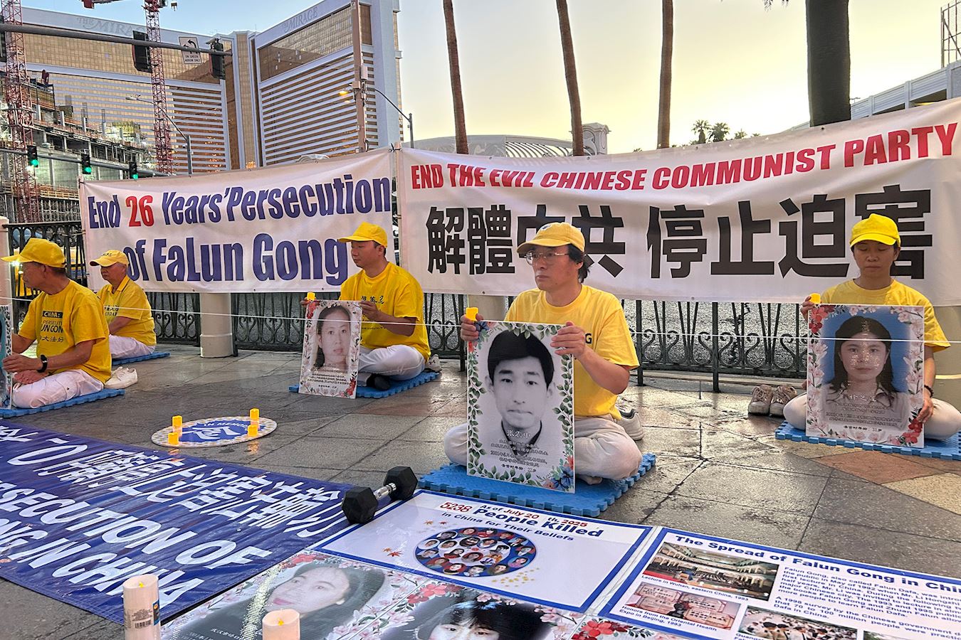 赌城的夏季炎热异常,即使到了傍晚时分也有华氏100度(近38摄氏度)。但赌场大道上仍然是人群密集、往来穿梭不息。法轮功学员顶着盛夏的酷暑在大道的一侧搭起了帐篷,架起了真相展板,展开醒目的条幅,功法展示、烛光夜悼、发放真相资料及征集反迫害签名活动。