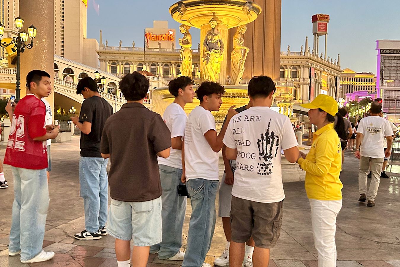 克里斯蒂安(Kristian)、凯尔斯(Kales)和杰登(Jayden)是北内华达大学的学生,假期结伴来拉斯维加斯旅游。他们听说过在中国发生的这场迫害,表示:“这实在是太糟糕了,太邪恶了。”