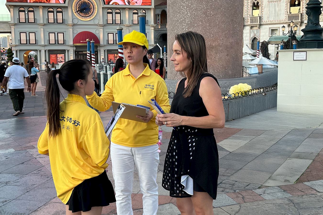 来自西班牙的克塞梅(Keseme)女士与家人一起到拉斯维加斯旅游,看到正在炼功的法轮功学员很好奇,也跟着学员一起做起第三套功法的炼功动作。
