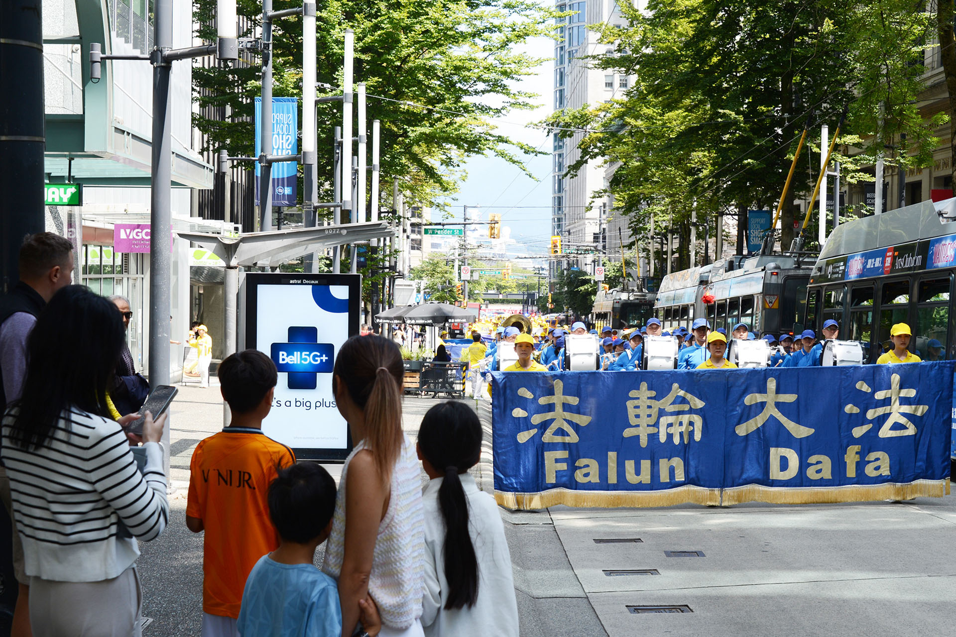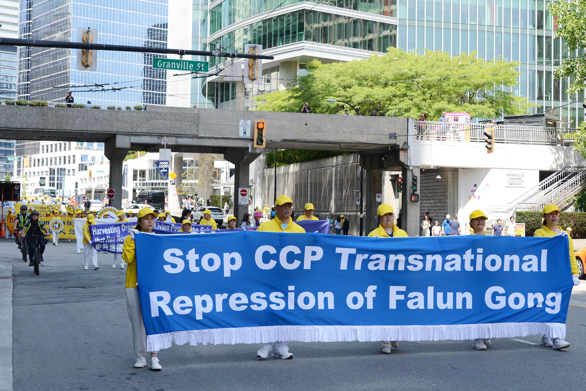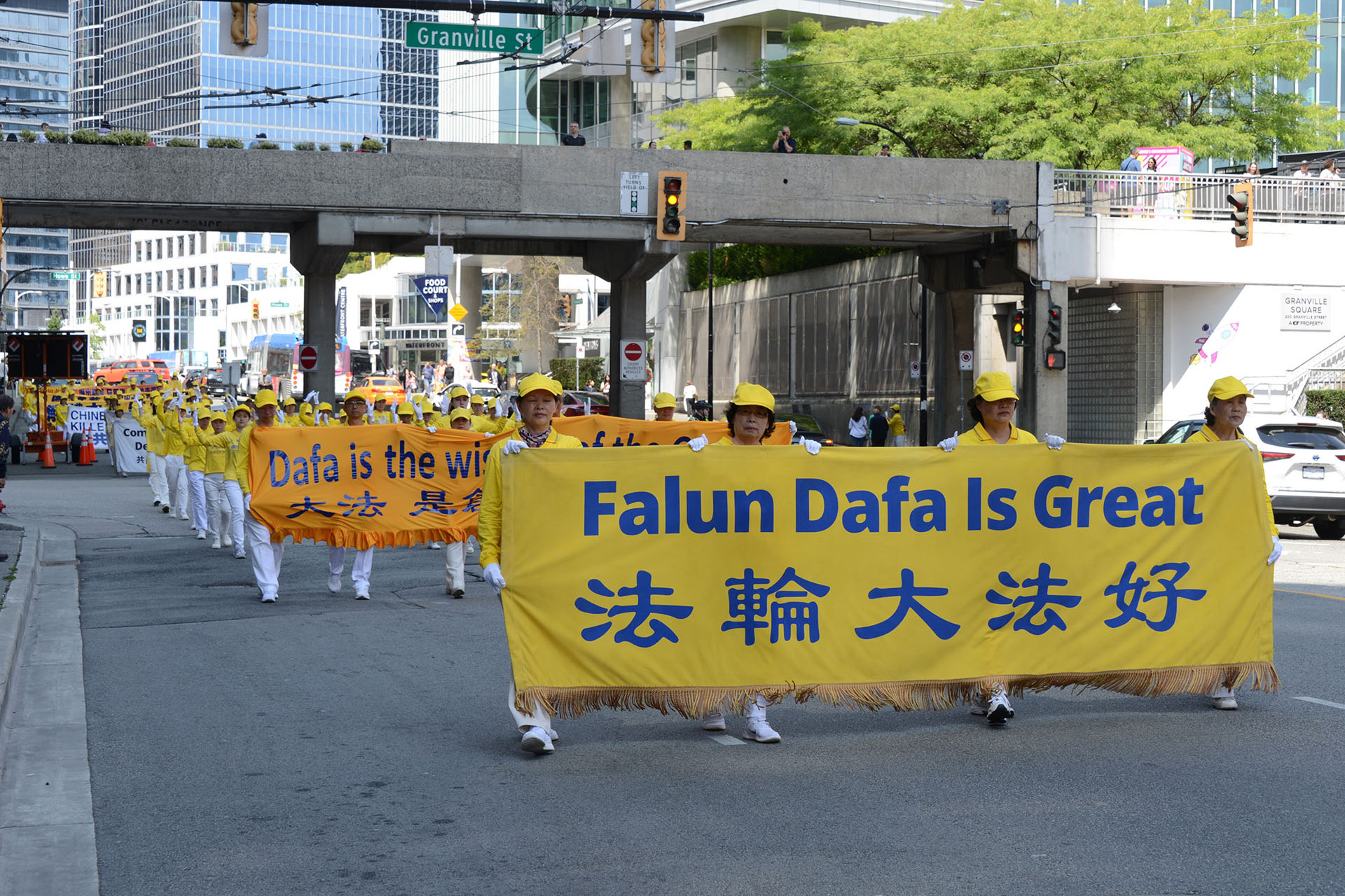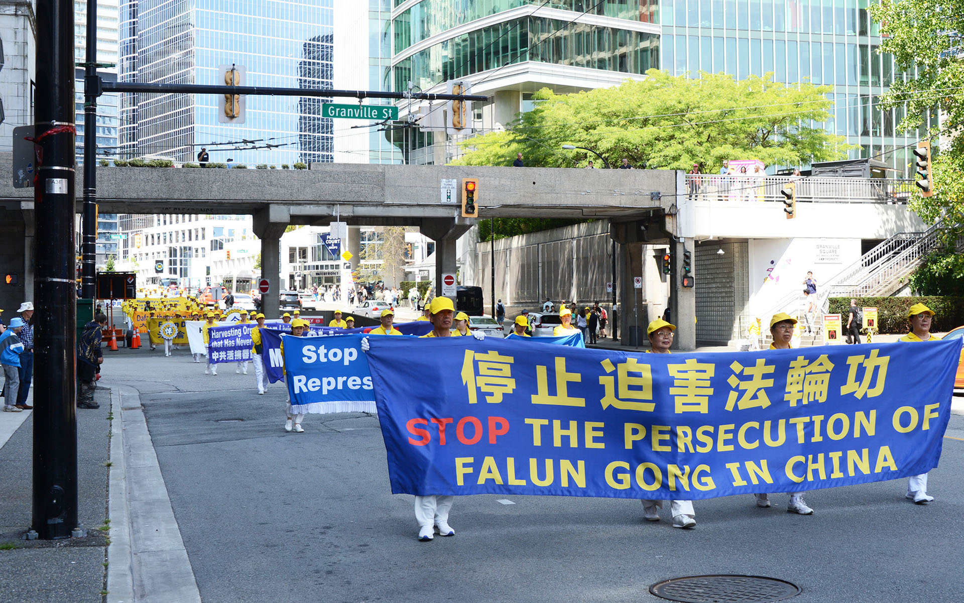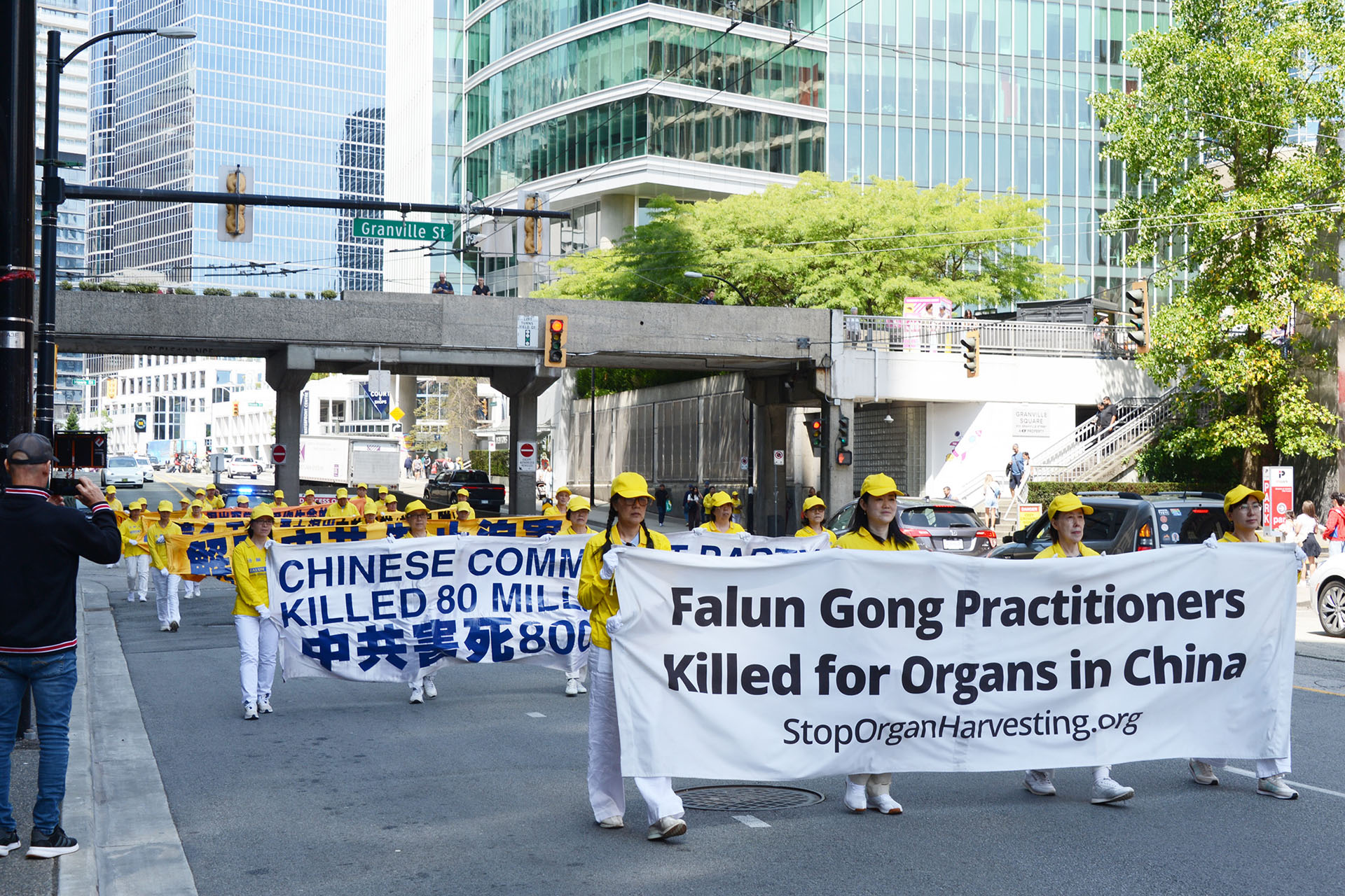 游行队伍途经温哥华市中心最繁华的街道,吸引了众多游人,他们纷纷驻足观看、拍照录像,或向游行队伍挥手致意,有些则大声朗读横幅上的句子。