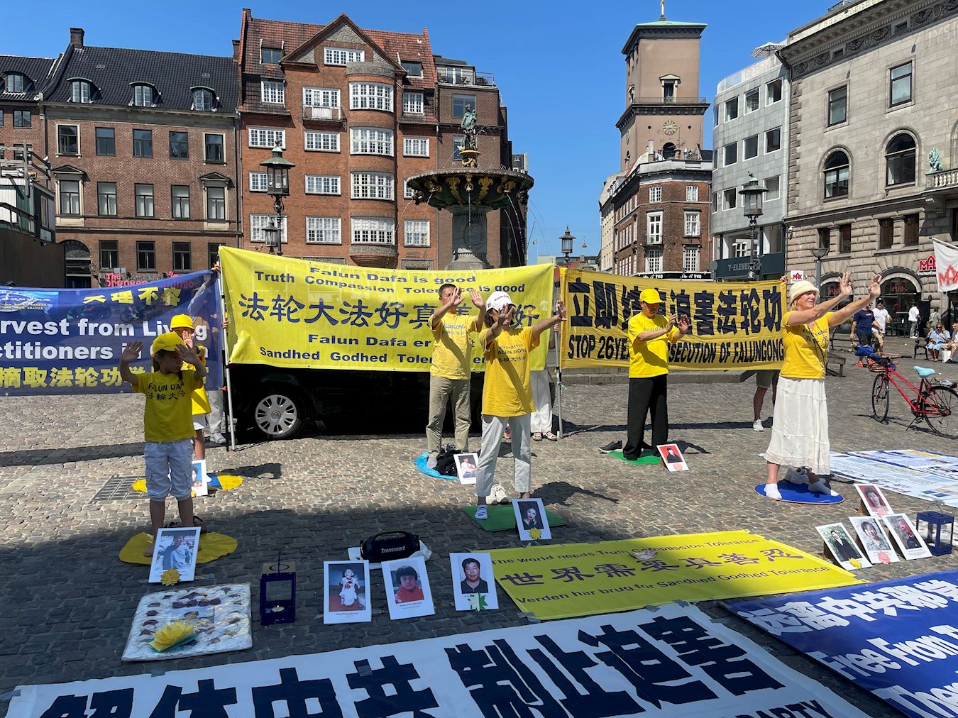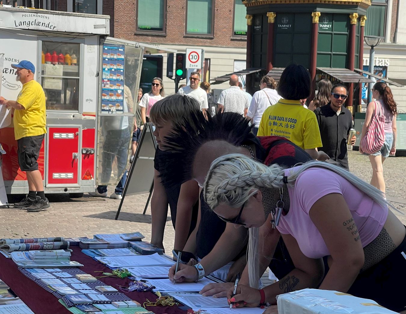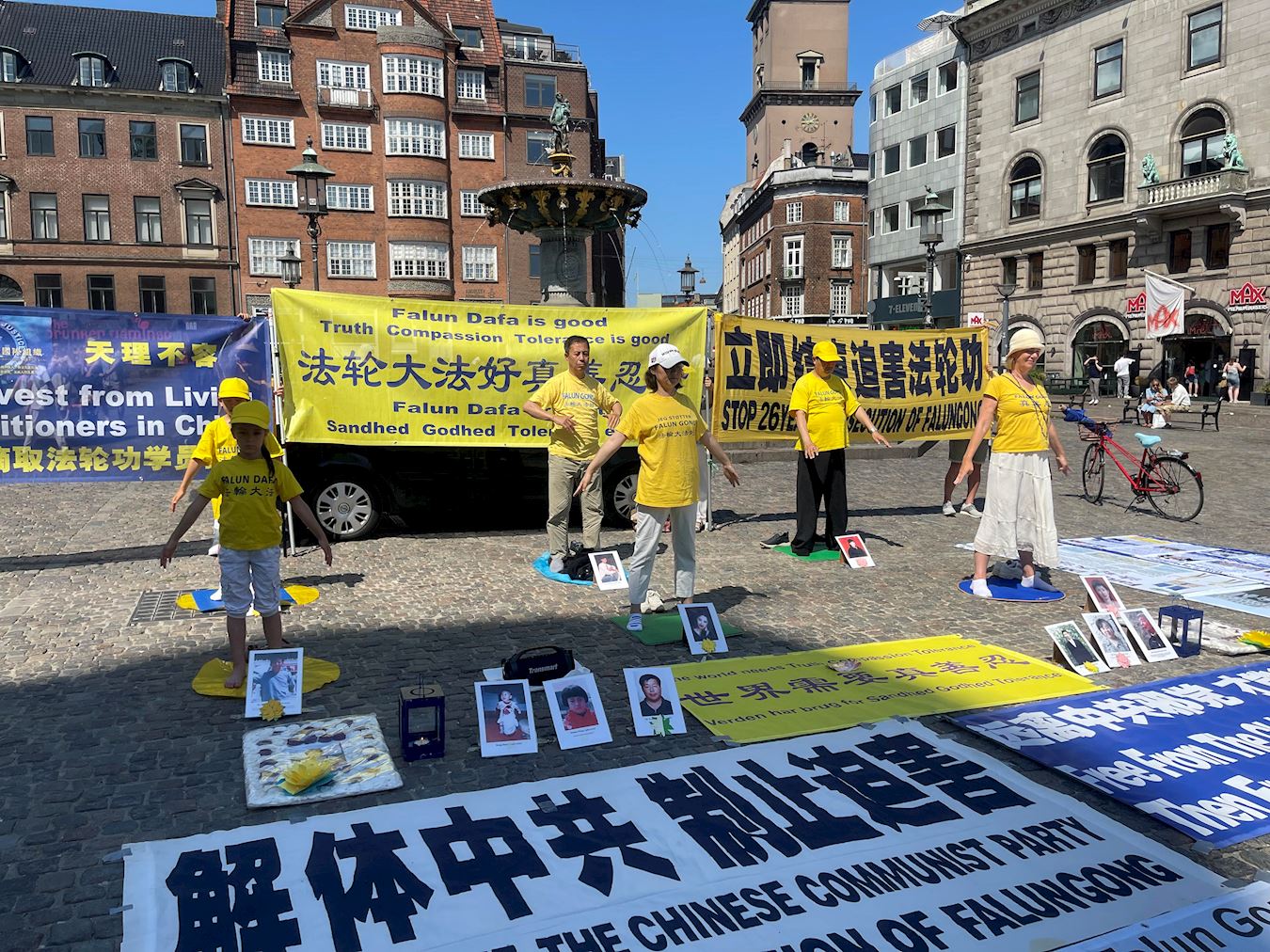 夏日的北欧天气是一年中最好的季节,周末正是人们享受大自然的好时光。 位于闹市区步行街旁的老广场人头攒动,熙熙攘攘。法轮功学员们拉起了中英文横 幅:“立即停止迫害法轮功!”“立即制止中共活体摘取法轮功学员器官。”“法轮大法好!真善忍好!”向民众传递着法轮大法的真相。