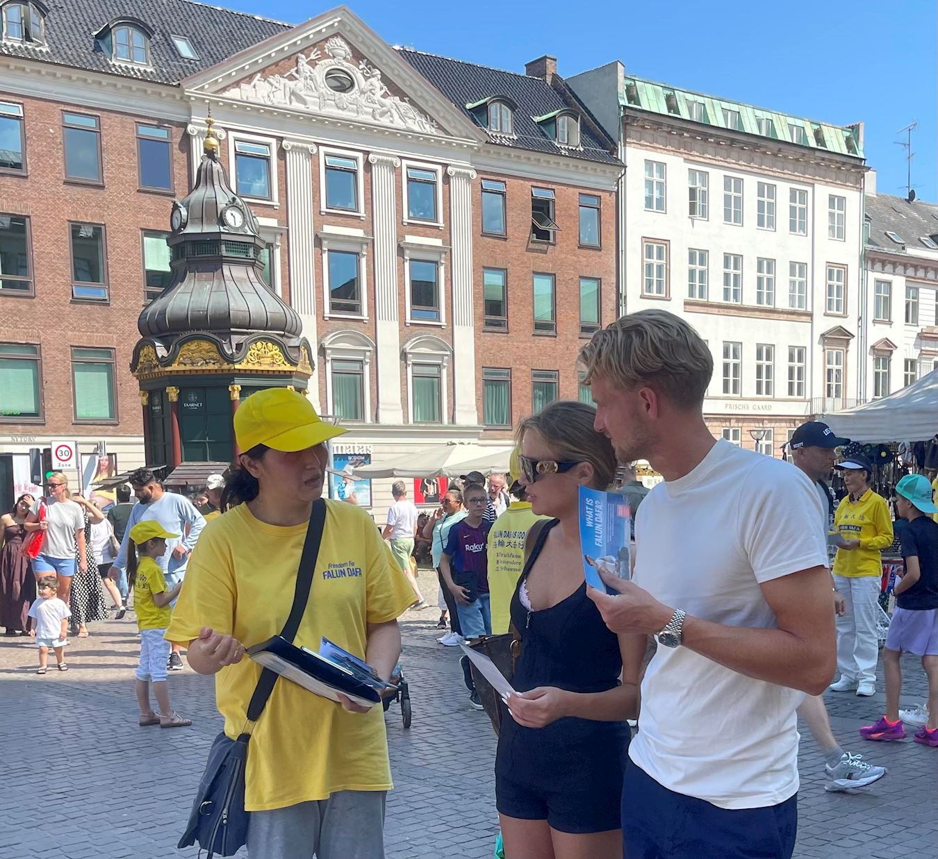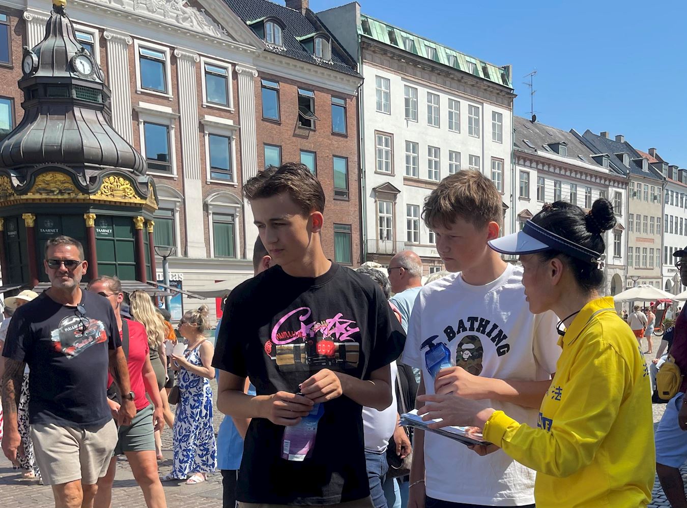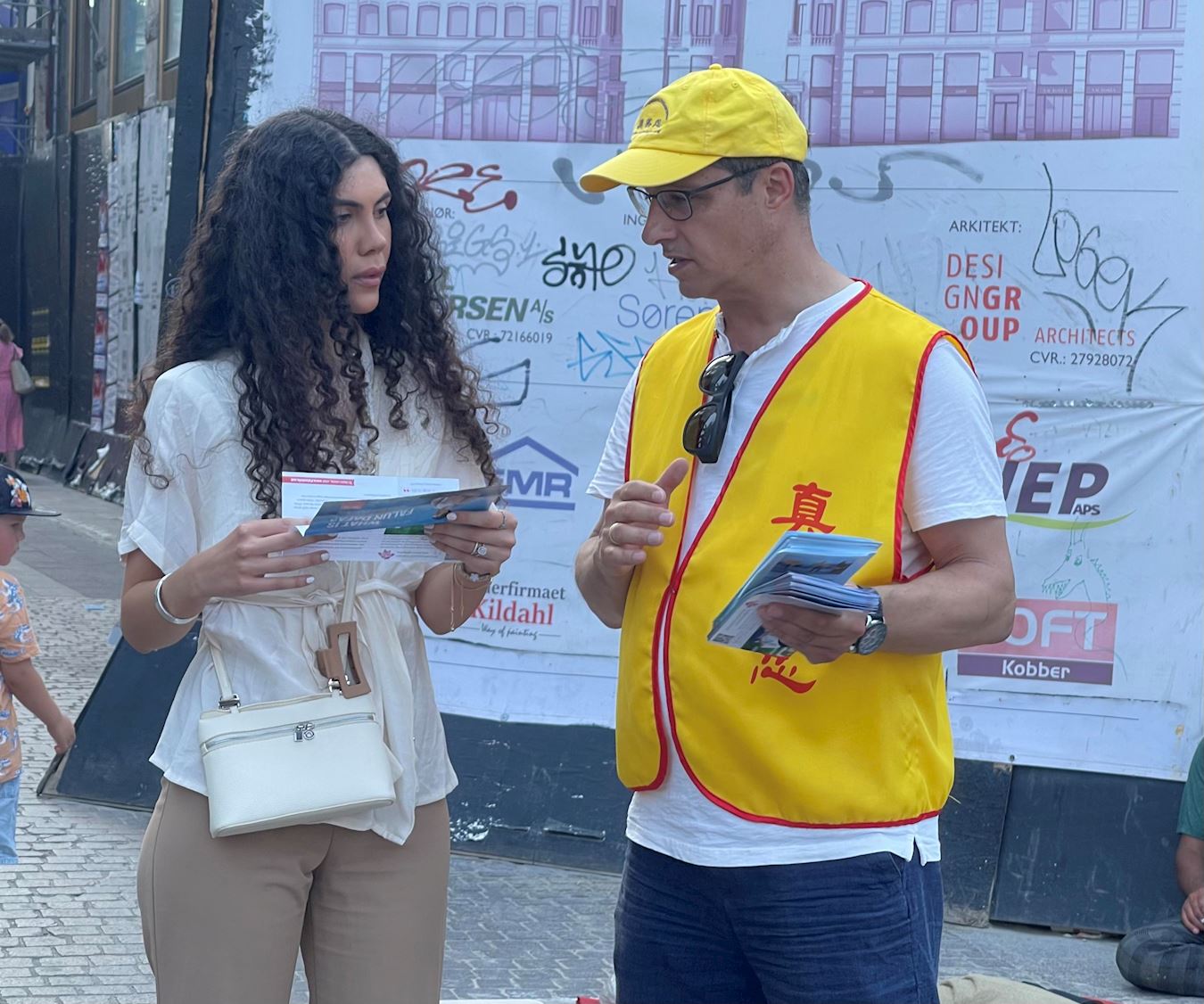 来自附近瑞典第三大城市马而默的法轮功学员帕特里克(Patrik),专程来到哥本哈根,参加这个特殊日子的反迫害活动。他向来往于活动现场的人们,介绍法轮大法的美好和中共迫害法轮功的真相。