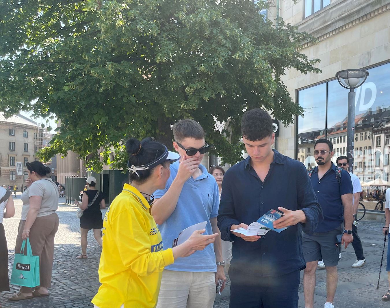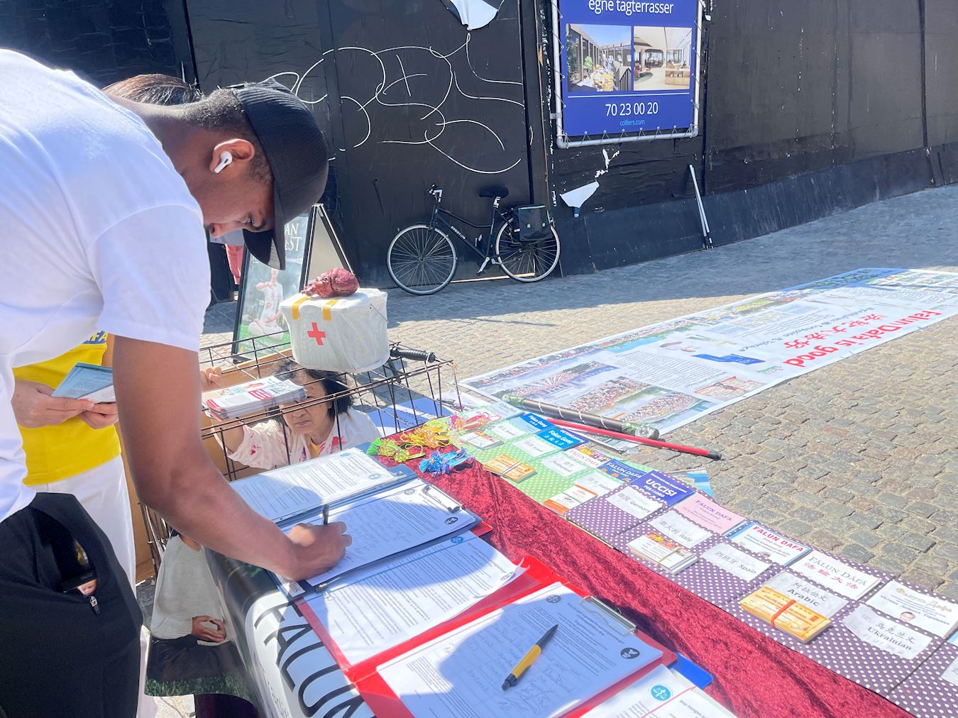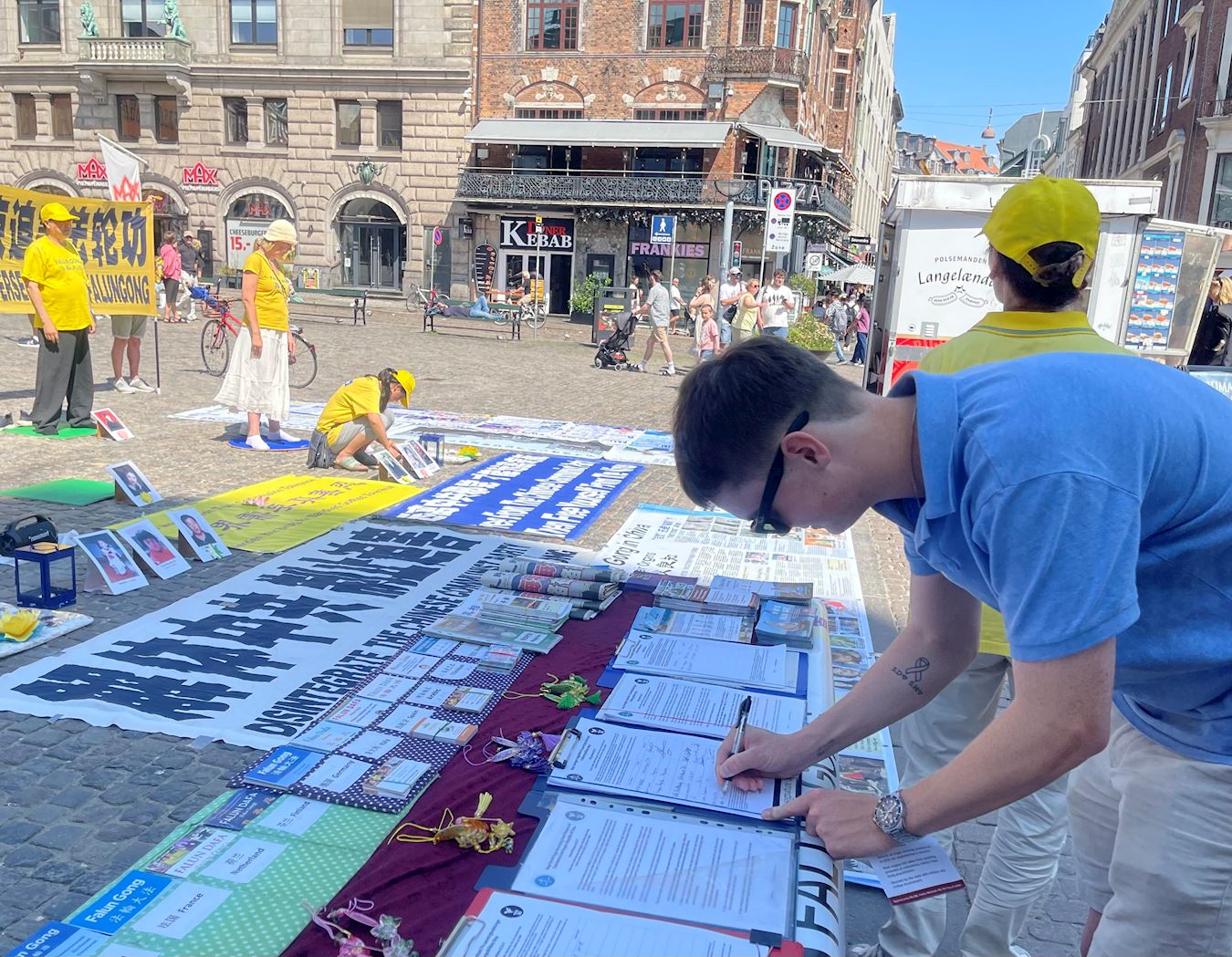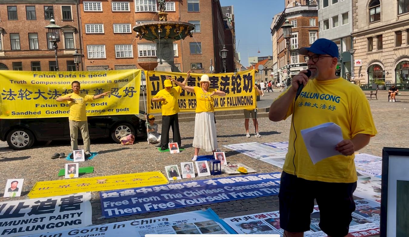 来自附近瑞典第三大城市马而默的法轮功学员帕特里克(Patrik),专程来到哥本哈根,参加这个特殊日子的反迫害活动。他向来往于活动现场的人们,介绍法轮大法的美好和中共迫害法轮功的真相。