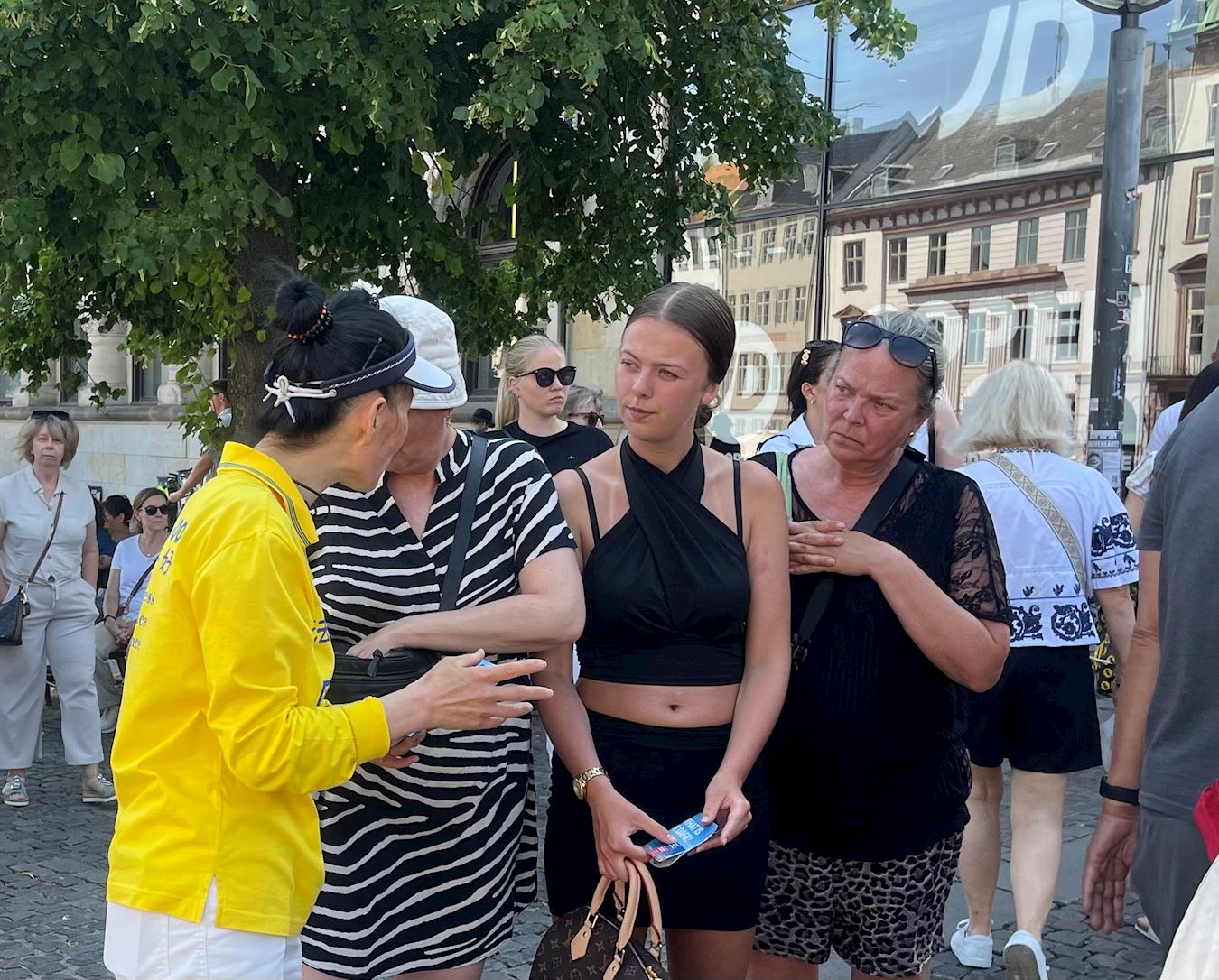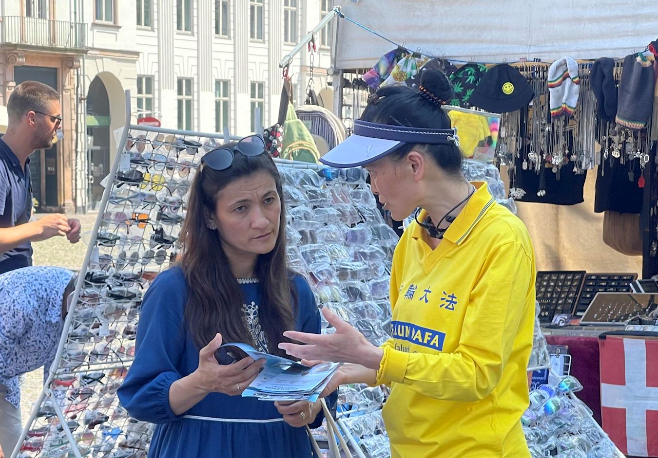 有三位丹麦女士结伴来到法轮功学员的活动场地。她们停下脚步,接过真相传单,转眼看到现场:学员被关在铁笼中的酷刑模拟展,使她们震惊不已。法轮功学员给她们介绍了详情,她们表示:无法接受这样的残酷现实。