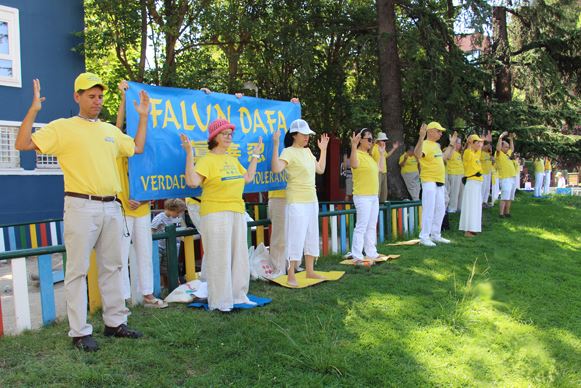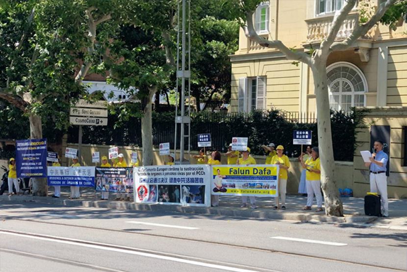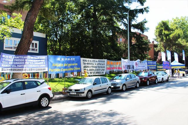 在马德里和巴塞罗那中使领馆前,法轮功学员静静地举着横幅,一面面醒目的横幅、标语牌、真相图板和传单都在告知世人中共侵犯信仰自由、非法关押、酷刑折磨甚至活摘器官、残暴迫害法轮功学员的种种罪恶行径。同时法轮功学员通过展示优美舒缓的法轮功五套功法向人们传递着法轮大法的美好。