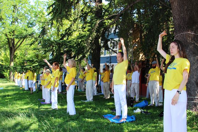 ![]() 图1~3:二零二五年七月十八日西班牙法轮功学员在马德里中使馆前举办反迫害集会,举着真相横幅和展示优美舒缓的法轮功五套功。 |
