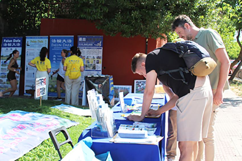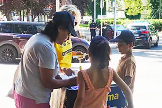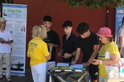 伊利娅(Iria)女士和她的两个孩子经过集会场地,在了解法轮功真相后,立刻签名表示对中共的谴责和对法轮功学员反迫害的支持。她说:“希望早日推翻中国共产党,愿中国人得到信仰自由!”