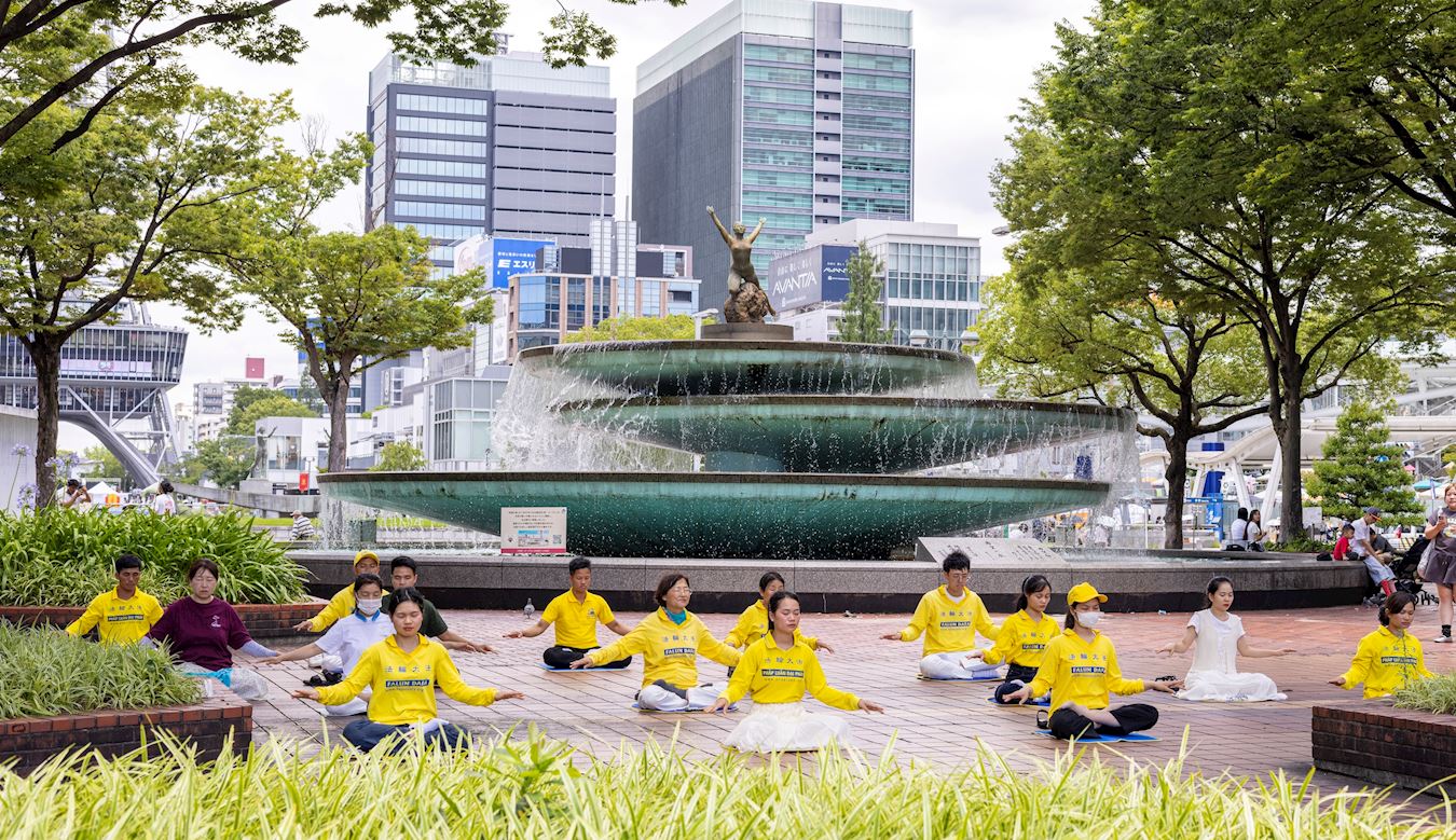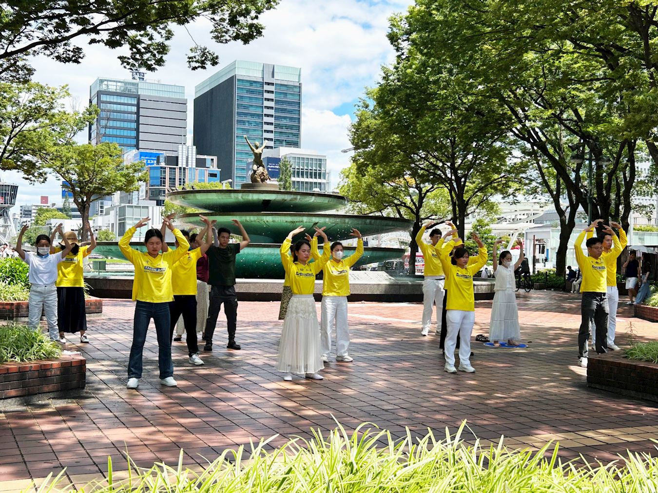 ![]() 图1~2:二零二五年七月二十日,法轮功学员们在名古屋市“荣”喷水附近炼法轮功的五套功法 |