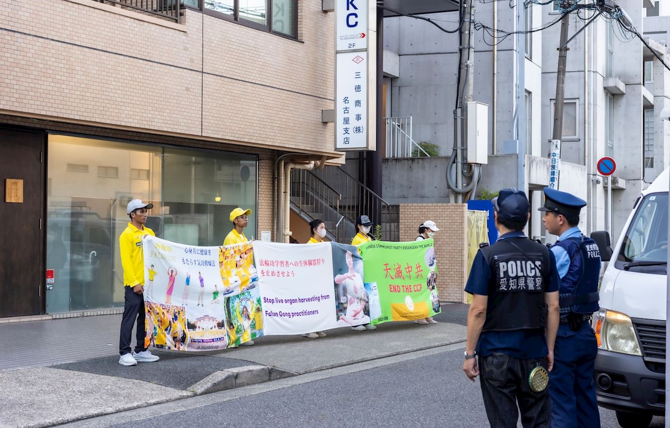 当天傍晚,法轮功学员们也去名古屋中领馆前继续举行反迫害的和平抗议。他们手持横幅,呼吁:停止对法轮功学员的活摘器官暴行,要求中共立即停止迫害。