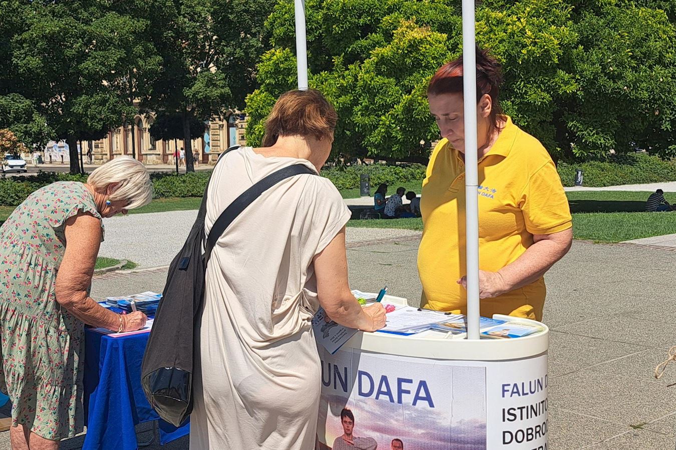 很多行人看到法轮功真相横幅后,直接走到信息台询问如何支持反迫害。背带托着小婴儿的教师纳迪娜(Nadina)就是其中一位,学员告诉她签名的地方。她立即到征签处签名,她告诉学员:“就是应该签名声援,停止这种迫害。”