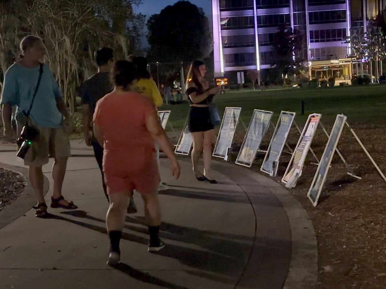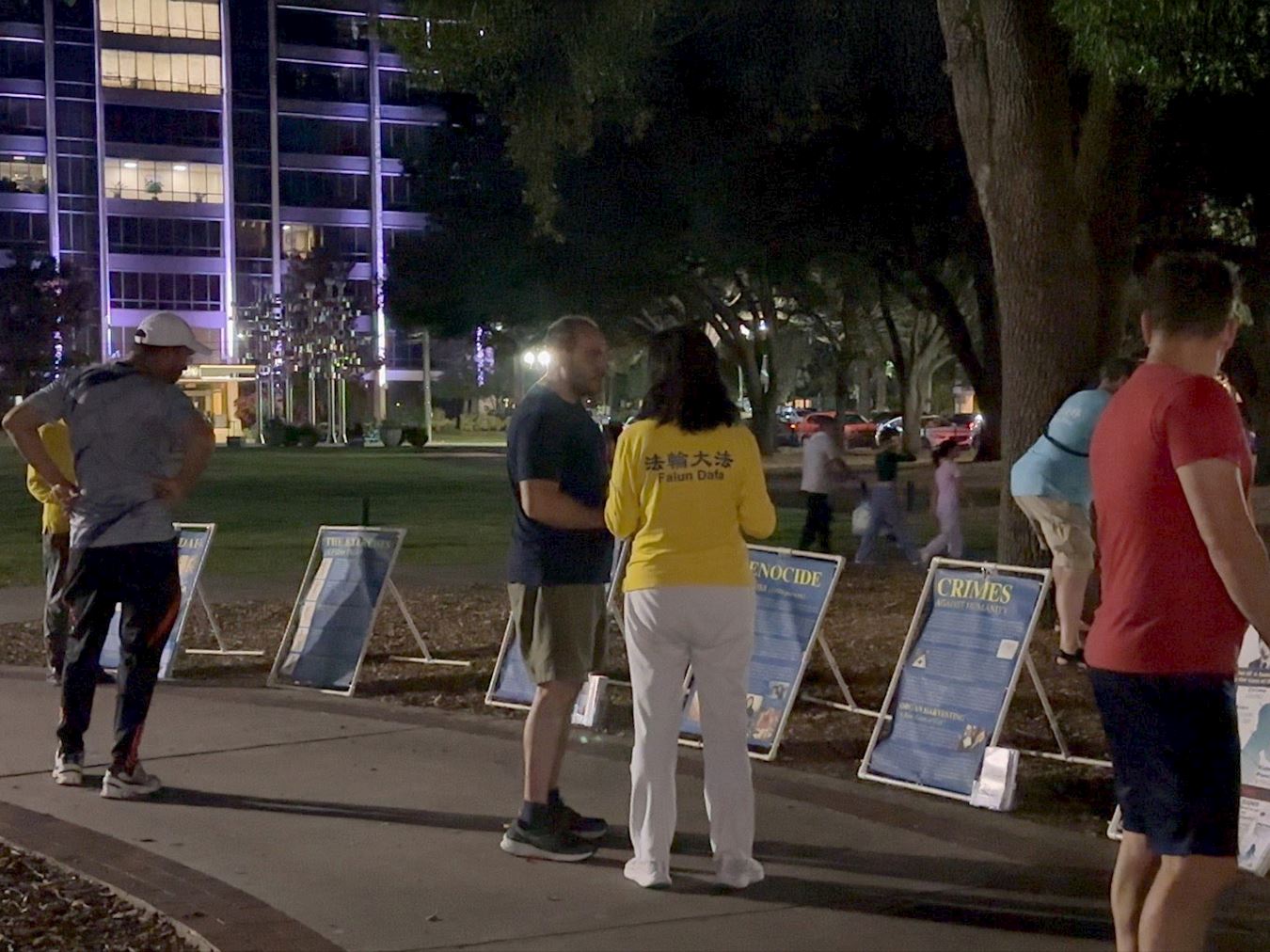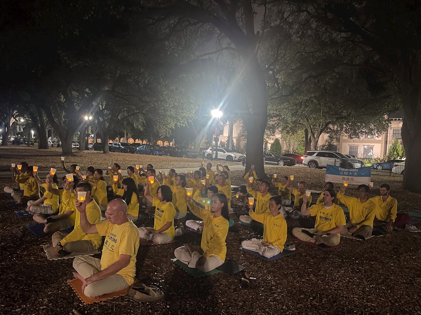 当夜色降临时,法轮功学员在伊奥拉湖畔举办烛光悼念活动。他们静静地席地而坐,点亮手中的蜡烛,悼念那些因坚守信仰而在遭中共迫害致死的法轮功修炼者。点点烛光映照着他们平静而坚毅的面容,展现出他们在高压下依然坚守信仰的勇气与力量。整个场面庄严肃穆。
