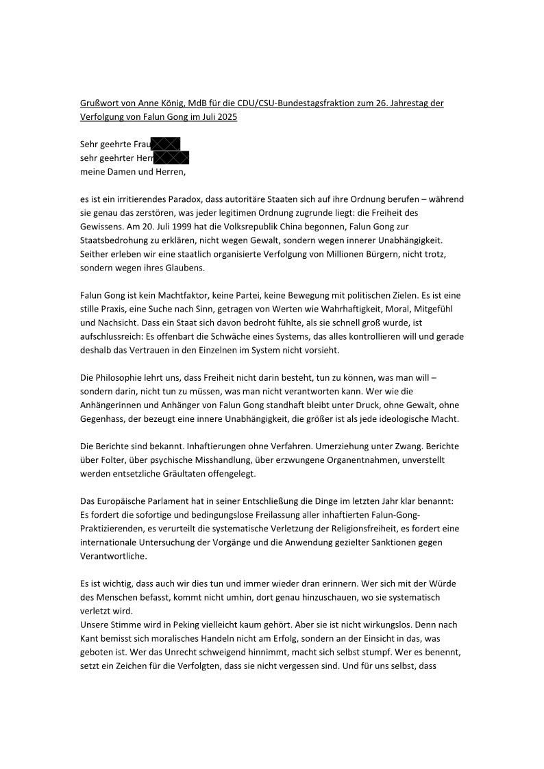德国基民盟(CDU)联邦议会议员、国际气候与能源政策小组委员会主席、外交事务委员会主席安妮·柯尼希(Anne König)来函: