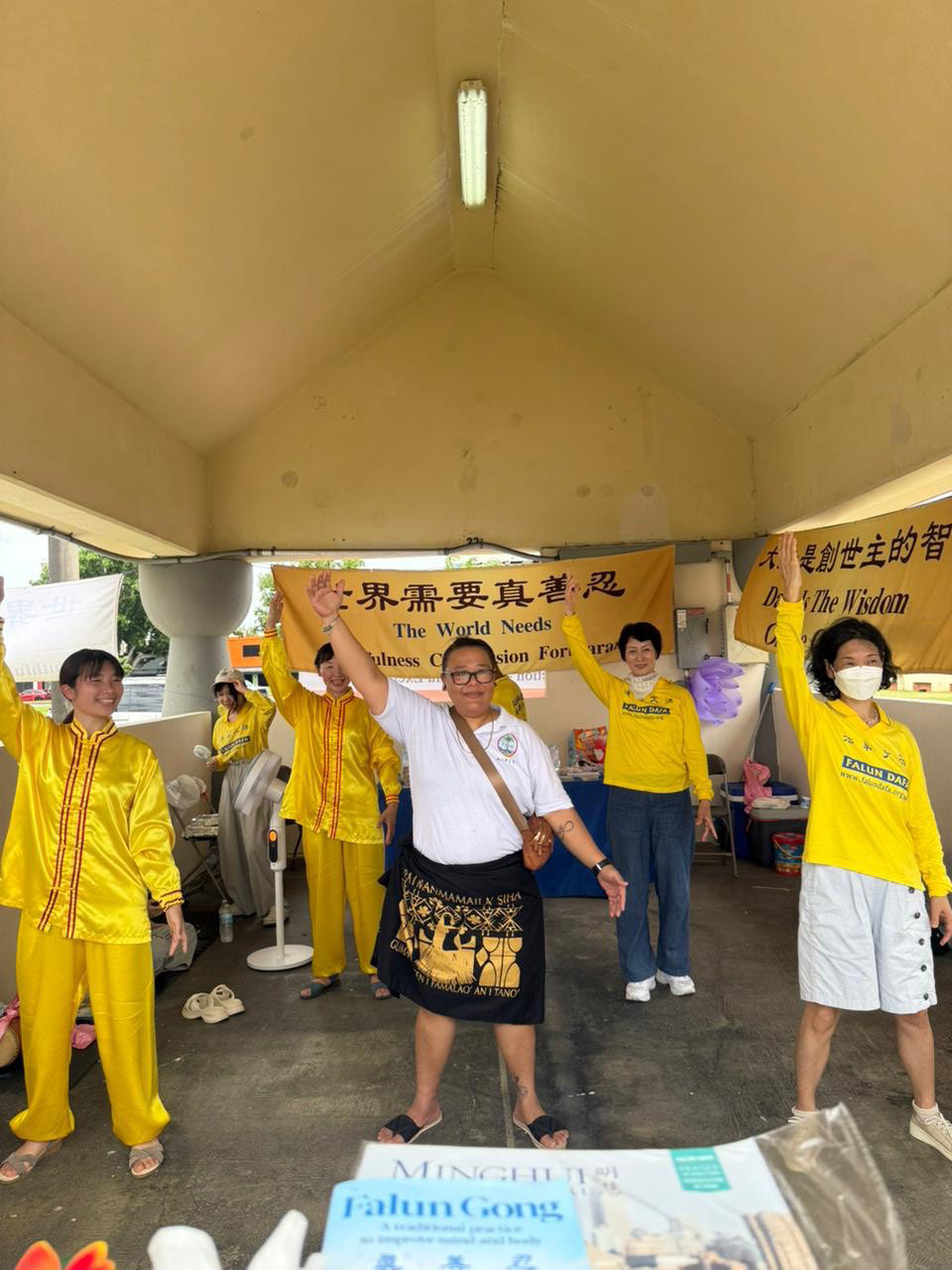 值得一提的是,七月二十二清晨,数十位来自台湾与日本法轮功学员在下榻饭店旁的马塔潘海滩(Matapang Beach)公园炼功时,吸引了在附近的博克赛支架大洋舟俱乐部(Poksai Canoe Club)总教练娜塔莉(Natalie)的注意。