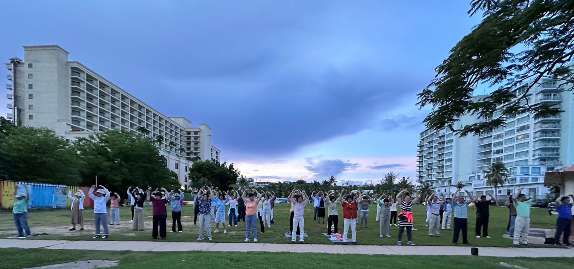 在关岛查莫洛夜市,当地学员租用两座西班牙传统风格的亭子,且用醒目的各式横幅、莲花与看板布置得典雅别致,吸引了许多游客驻足观看。来自台湾与日本的学员也利用空档与当地学员一同向现场的有缘人介绍法轮功,分享修炼的美好与身心受益的经验。天国乐团与腰鼓队的表演吸引大量民众观赏,许多人在观赏后主动前往摊位了解法轮大法的真相,甚至当场学炼功法。