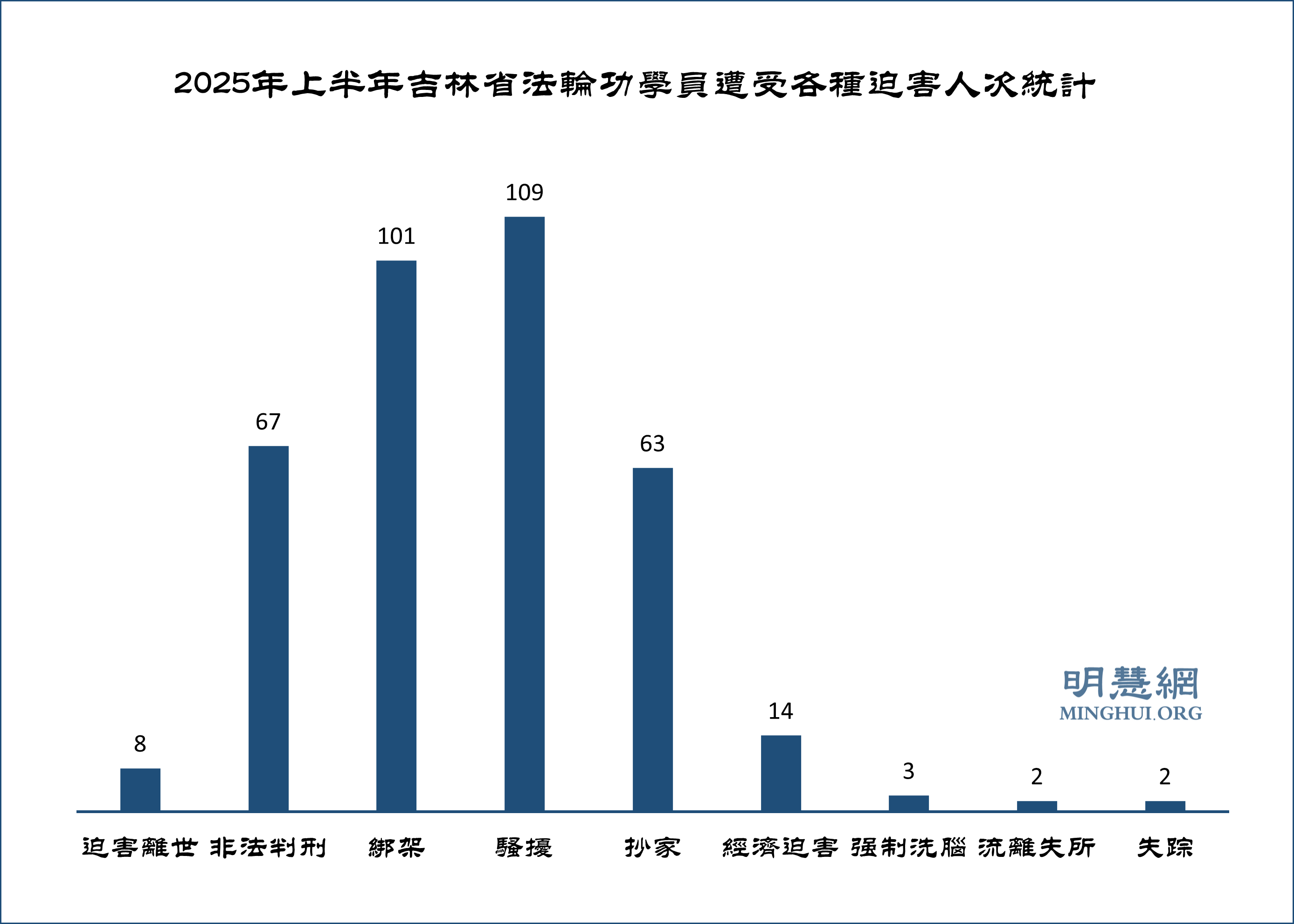 ![]() 图1:2025年上半年吉林省法轮功学员遭受各种迫害人次统计 |