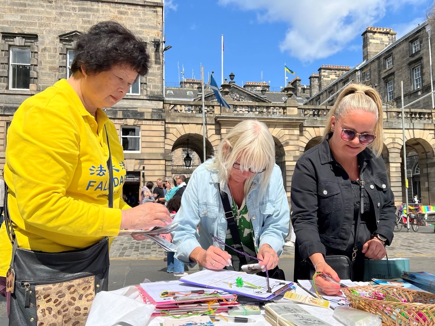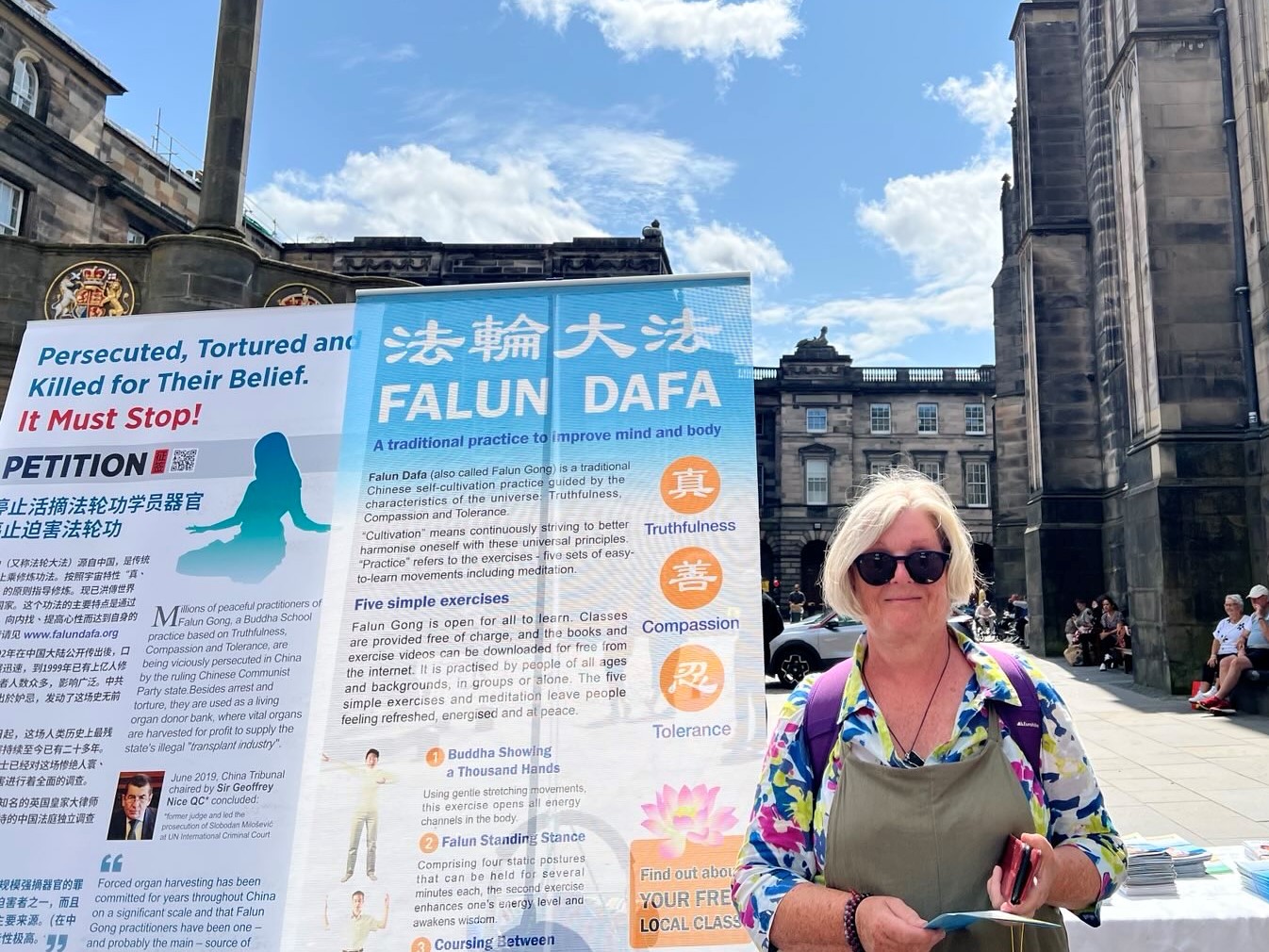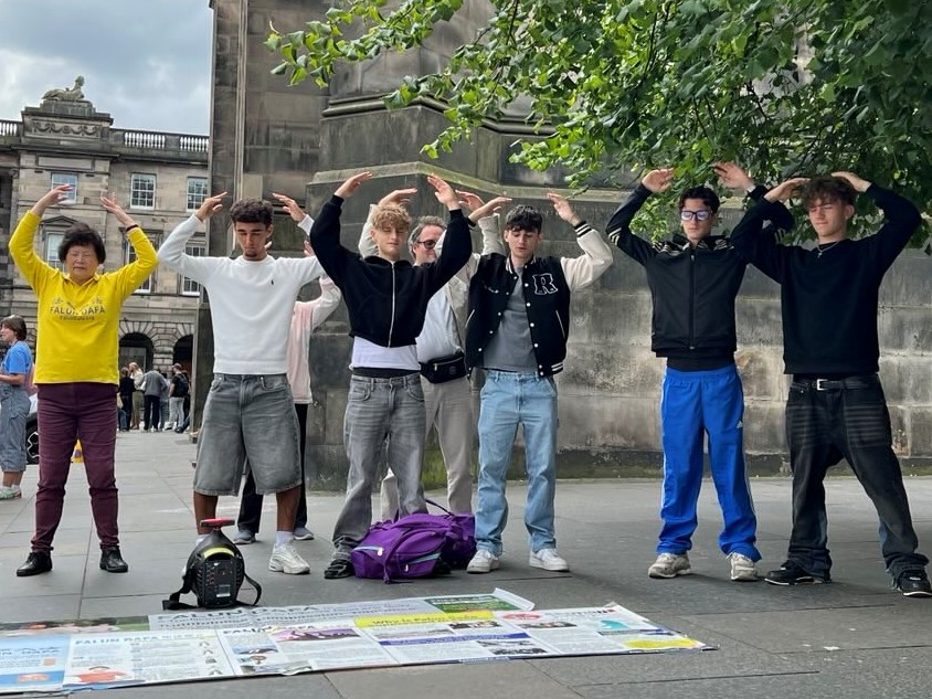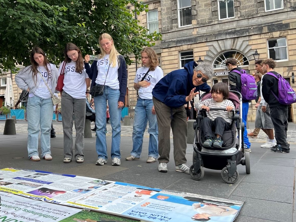 活动地点设在著名的王家一英里大街,爱丁堡市政厅对面的议会广场(Parliament Square)。街上游人如织,世界各地不同种族的人了解了法轮功真相后,签名声援学员制止迫害,也有人对法轮功祥和的功法产生兴趣,表示要学炼功法。
