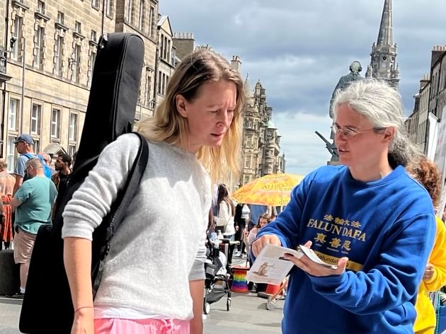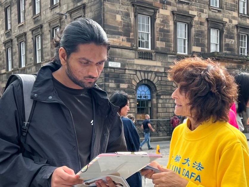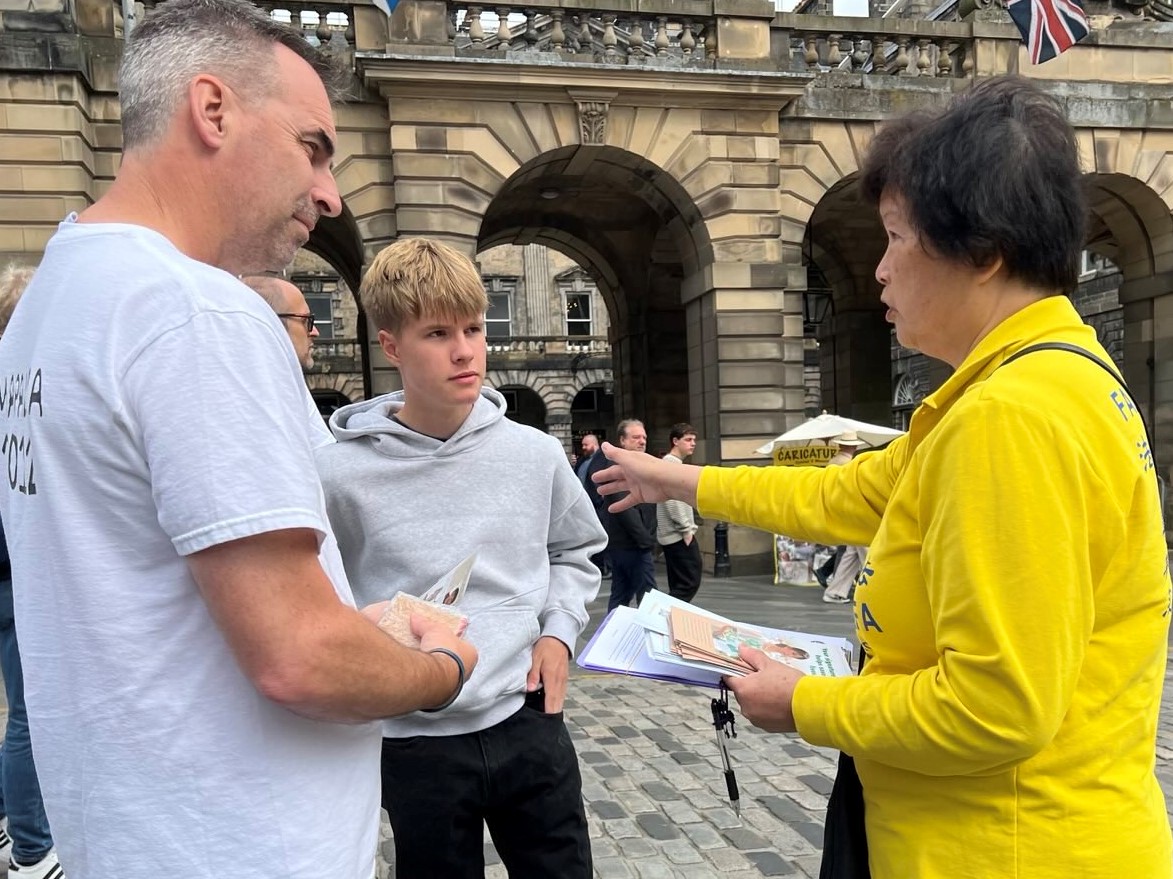 这位香港女士感谢法轮功学员为向英国政府和民众 一位来自中国大陆的女士,在爱丁堡工作,看到学员的展位很惊讶:“法轮功在国外都这么自由炼功的吗?”得到肯定答复后,她边听学员介绍真相,边用手机拍照,并收下学员递给她的真相资料。之后她再次来到展位,拍下每个展板上的内容。她告诉学员:“我必须去上班了,我一定会再回到你们这里。” 由二十多名中小学生组成的中国旅游团从展位前经过,有两三个学生边走边响亮的大声念着展板上的信息:“法轮大法,法轮大法。” 大陆留学生见证中共迫害 “我是法轮功学员遭受迫害的见证者。”一位华人留学生告诉学员,“我已多次为你们的反迫害签名,今天我再签一次。” 这位华人学生表示自己了解一九九九年中共迫害法轮功之前,很多高官都修炼法轮功。而他的同学全家因修炼法轮功而遭受了中共的迫害。他回忆这位同学的父母因修炼法轮功,分别被中共非法判刑七年。就在父母遭受牢狱之灾时,中共截断了他同学的爷爷、奶奶的养老金,原因是两位老人坚持信仰,不放弃修炼法轮功。一家人失去经济来源,生活陷入绝境。 “中共迫害好人的事实不应被掩盖。” 这位华人学生常常和别人讲述这个同学一家因为修炼法轮功而遭受的迫害,同时,他也很关注中共活摘法轮功学员器官的罪恶,他说:“现在越来越多的中国人开始相信中共犯下活摘器官的罪行。” 这位华人留学生还表示看过《·九·评*共产党》,“我自己早已三:退.,还帮身边的人三:退.。” 法轮功创始人李洪志先生《为什么会有人类》等三篇文章在《大.纪.元;时报》发表后,他表示自己拜读了多遍。他说:“我的家族都是有信仰的人,李先生的文章坚定了我对信仰的信念。”