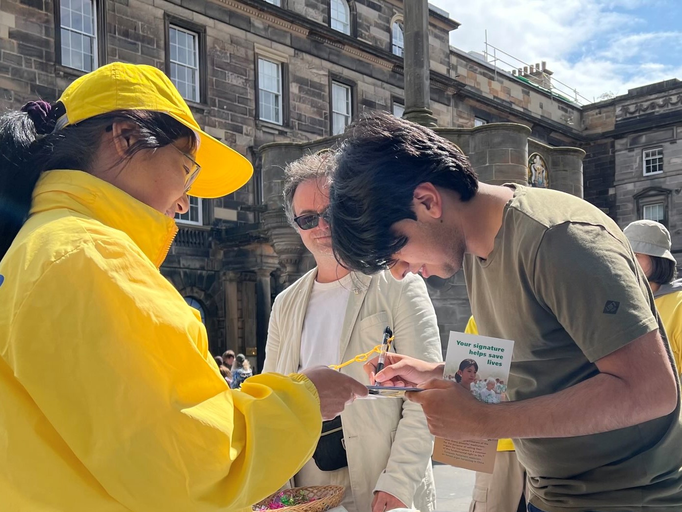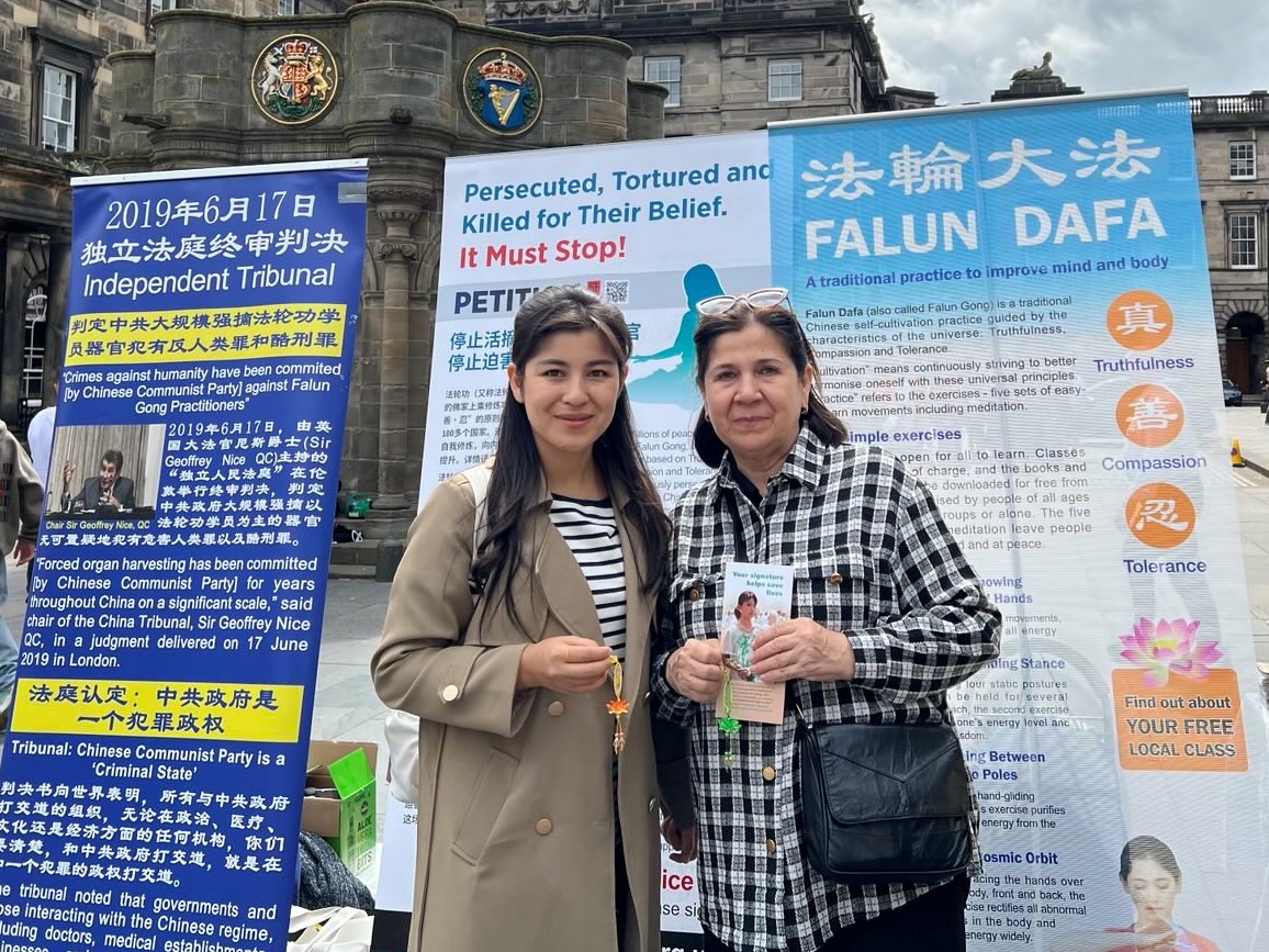 在伦敦留学的尼卢法尔·纳吉多娃(Nilufar Najidova)来自乌兹别克斯坦,在伦敦她常常看到法轮功学员的活动,明白法轮功被中共迫害的真相。今天,她和来英国探望她的母亲一起来爱丁堡旅游。她向母亲解释了学员正在做的事情,母亲娜娜·巴基法(Nana Bakifa)表情凝重,毫不犹豫地在征签表上郑重签下她的名字。