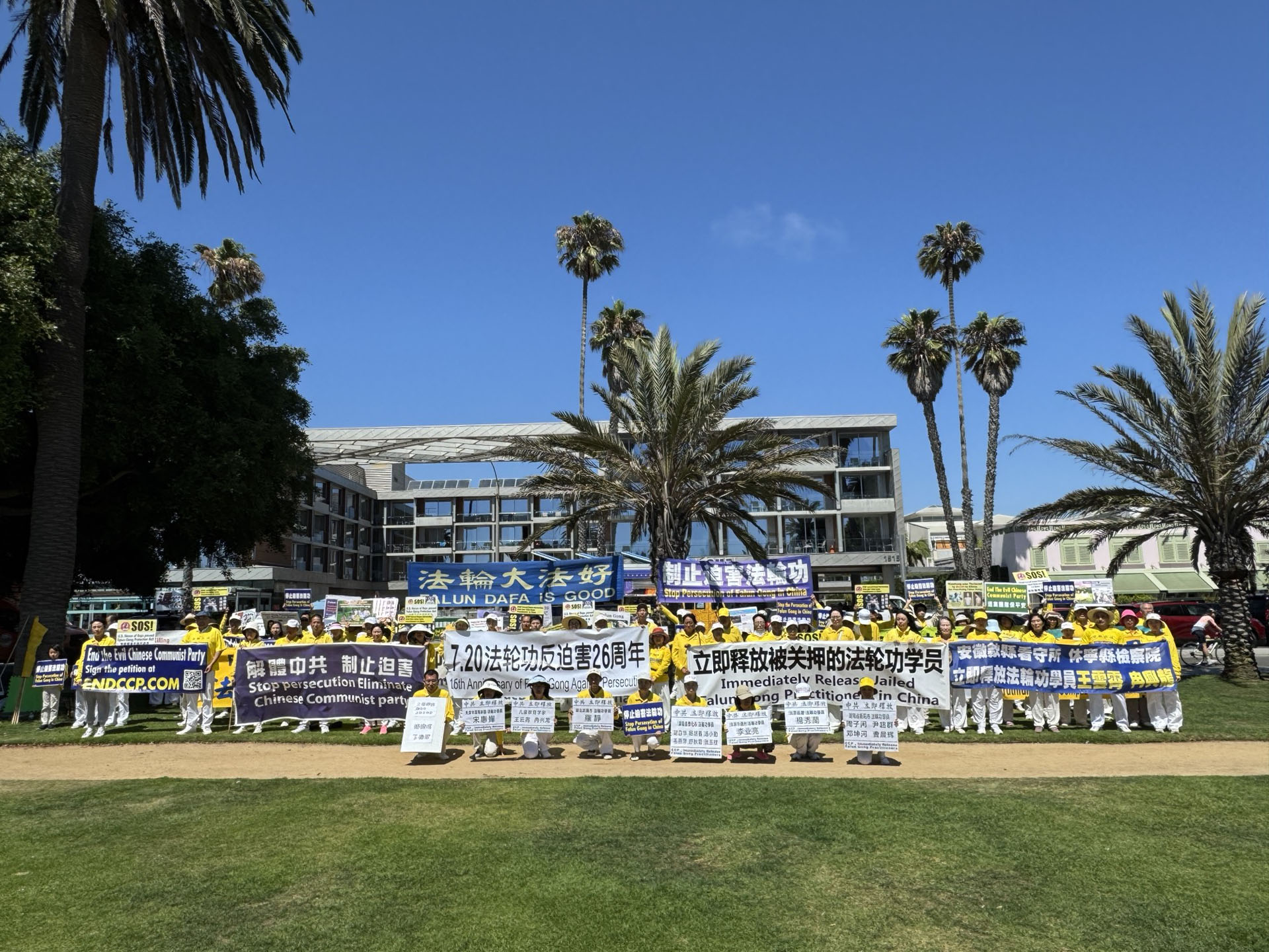二零二五年七月二十七日(周日),上百名洛杉矶法轮功学员聚集在人潮如织的加州旅游胜地圣莫妮卡码头(Santa Monica Pier),他们手持“活摘器官 天理不容”“停止迫害法轮功”等真相横幅与标语,引起往来游客注目和深思。有人表示:“这样善良的群体不应该遭受如此对待。”
