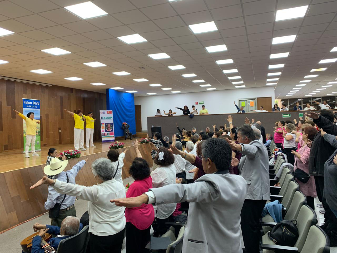 三位法轮功学员登台介绍了法轮大法的基本理念,强调真、善、忍的核心价值以及对身心健康的益处。随后,他们带领现场观众一起学炼功法动作,让他们亲身体验功法。