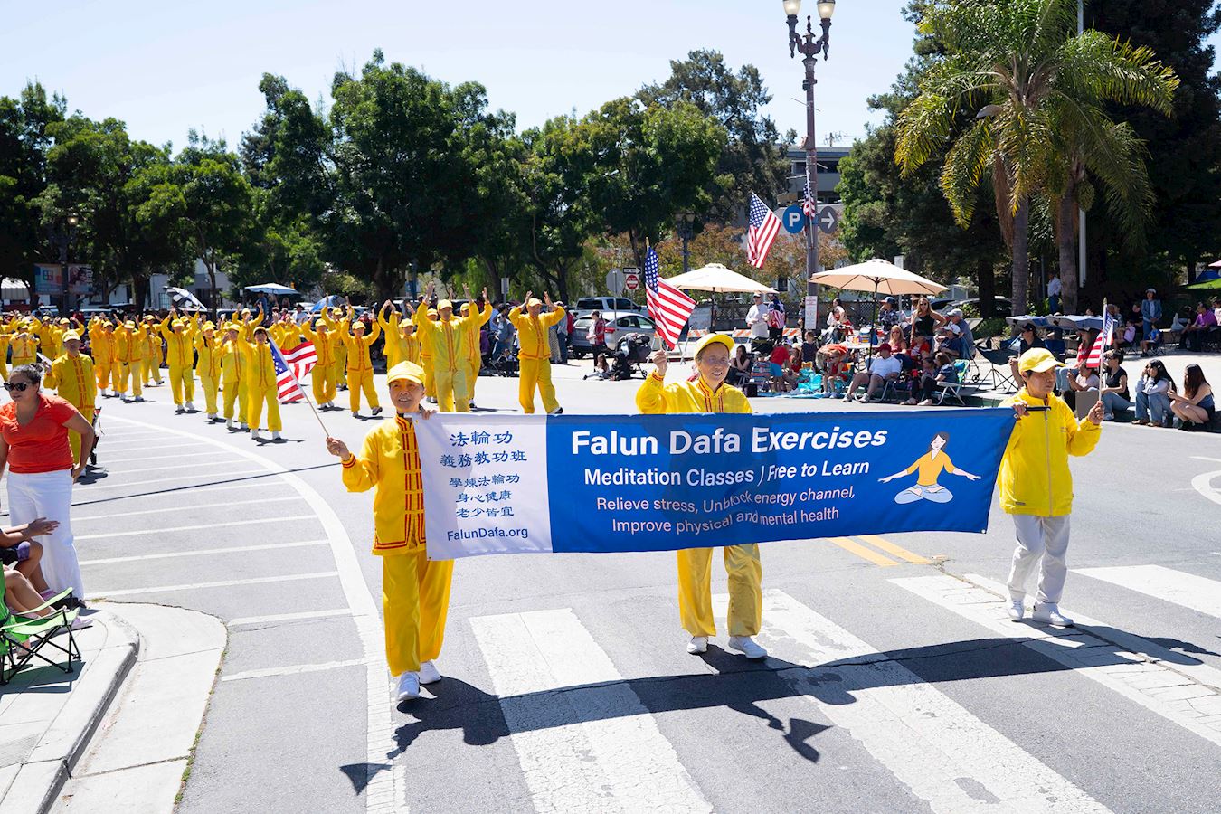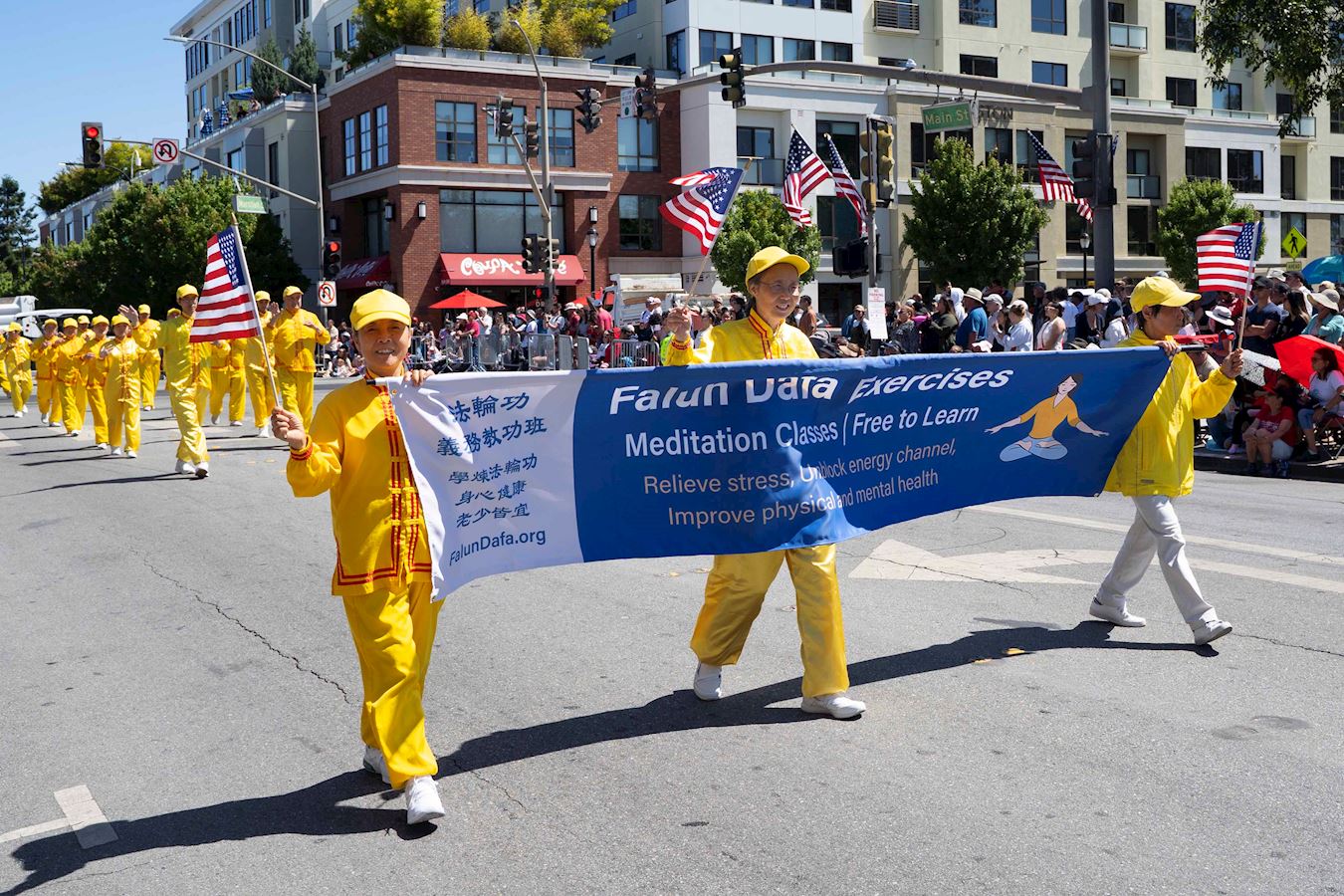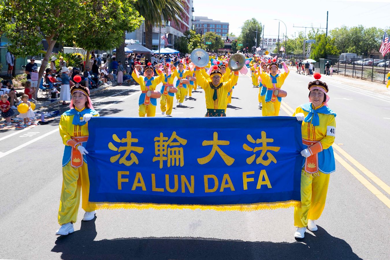 红木城游行是北加州最大的独立日游行,今年是第八十六届。当天,法轮功学员的队伍由炼功队、腰鼓队和花车组成。走在最前面的是法轮功学员的炼功队,他们向观众展示法轮功的五套功法。一路上,两旁的观众看到学员的队伍不断的鼓掌喝彩。