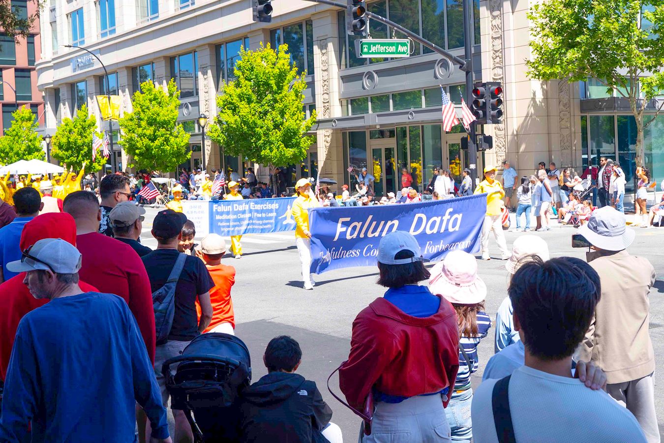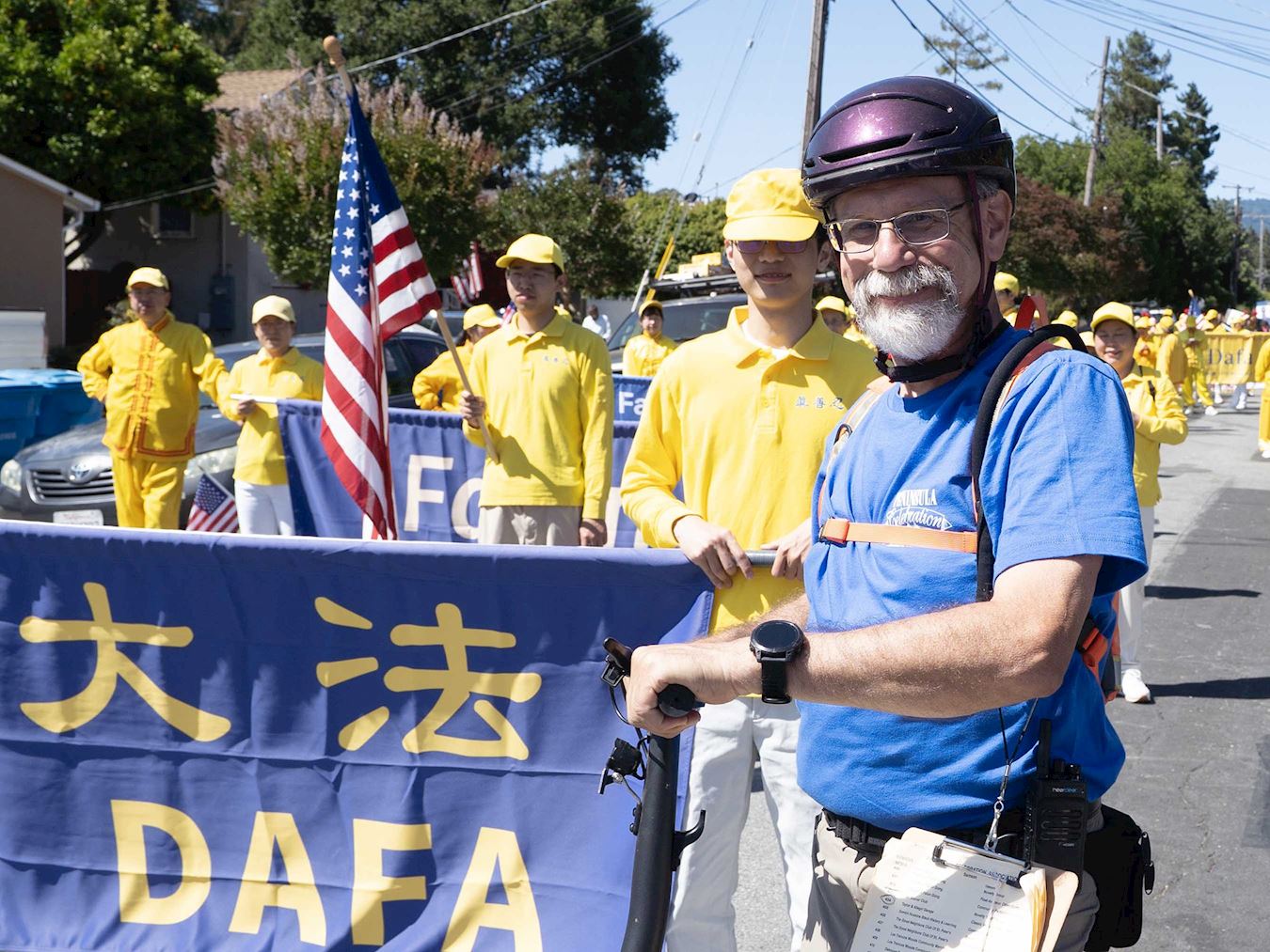 游行组织者、半岛庆祝协会(Peninsula Celebration Association)的杰夫(Jeff)很高兴看到法轮功学员的队伍,他骄傲的说,他还保存着去年他拿到的法轮功真相资料。他说,“我非常喜欢法轮功学员的队伍,他们知道自己在做什么,他们的颜色非常鲜艳亮丽,每个人都很尽职,他们太棒了。”