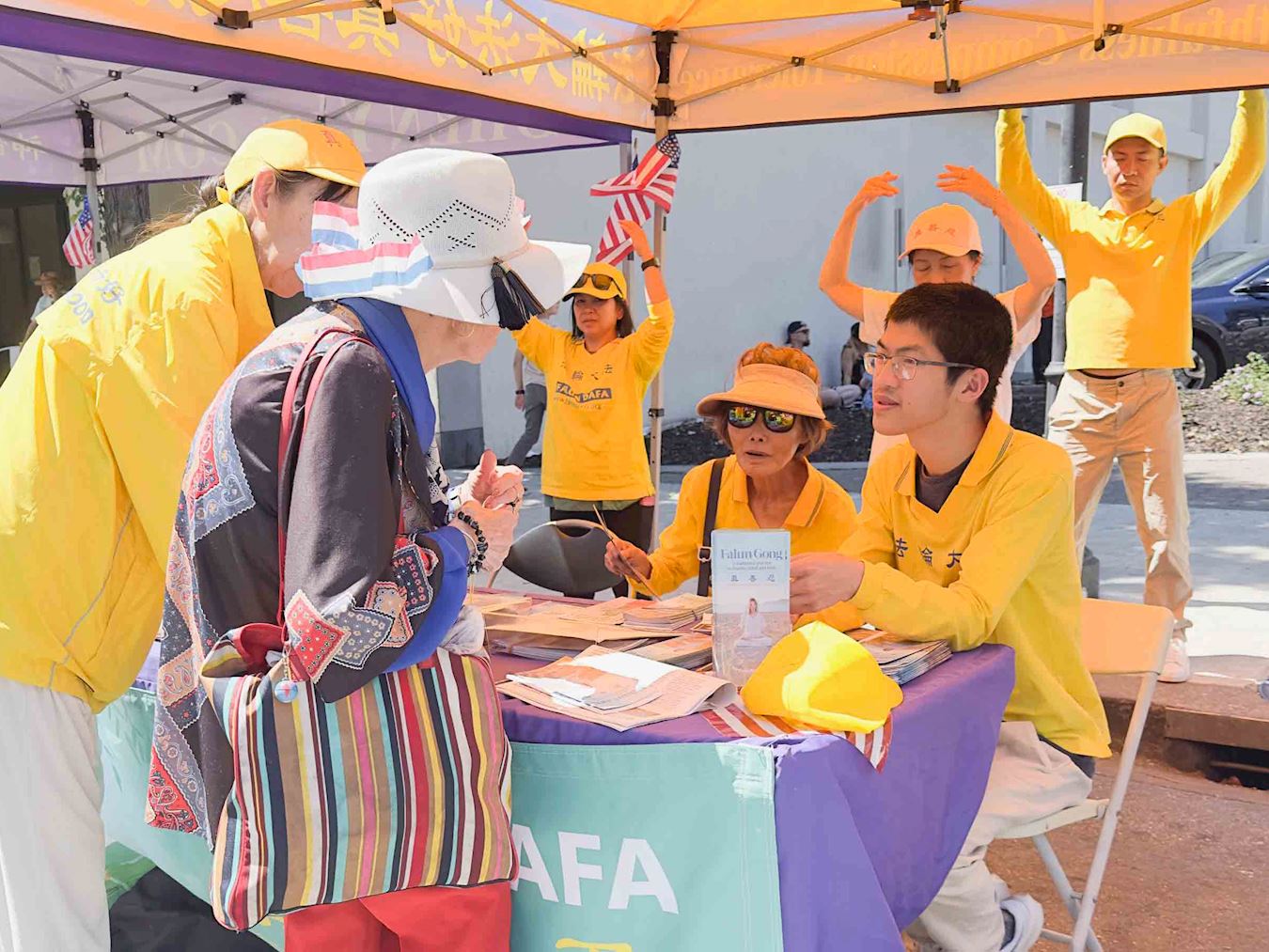 ![]() 图8:市民来到法轮功展位前与学员交谈,询问更多关于法轮大法的讯息。 |