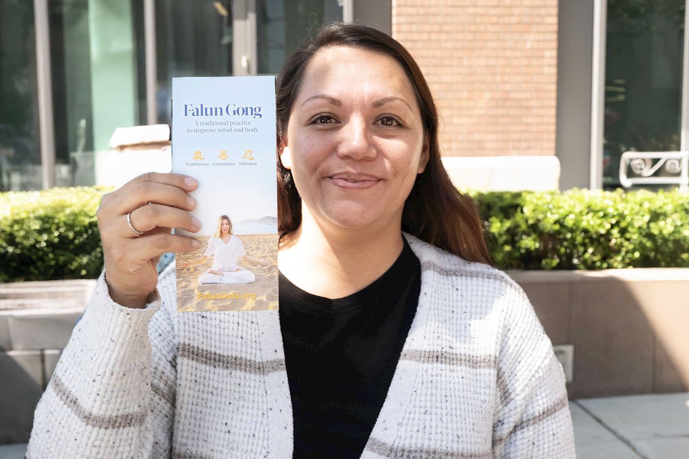 伊芙琳(Evelyn)说,“我很喜欢观看这支队伍,非常美,他们做的动作看起来非常放松。真、善、忍很美,现在世界上发生的事让人感到困惑,遵循真、善、忍可以帮助人们缓解压力,让我们的生活变的宁静,身体健康,太好了,很高兴你们让大家知道这些,我会进一步查询有关法轮功的资讯。”