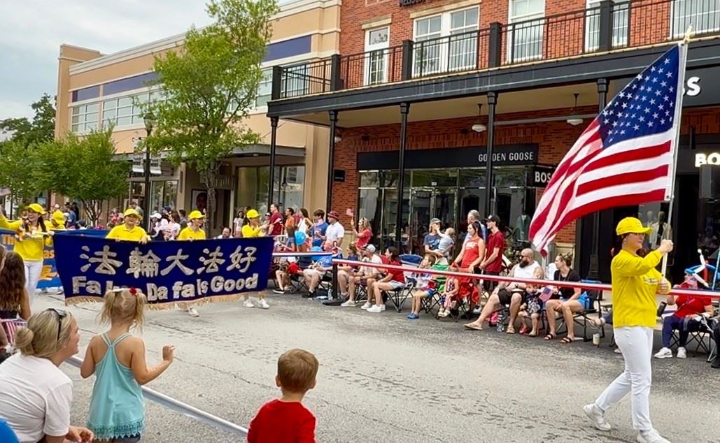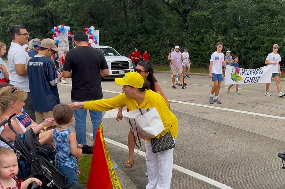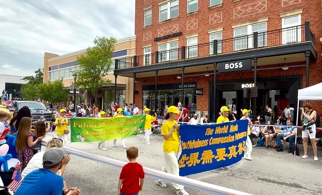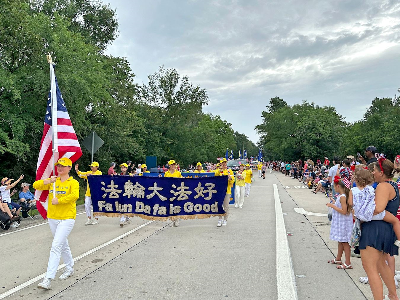 在热闹繁华的镇中心和市场街,各个游行团体盛装出席,喜气洋洋。走在法轮功队伍最前方的是手持美国国旗的学员,随后是“法轮大法好”、“世界需要真善忍”、“法轮大法在德州”的横幅队,以及花车、彩旗和腰鼓队等。路边民众有的挥舞国旗为学员鼓掌喝彩,有的用相机拍下法轮功的风采,还有的主动要真相资料,想了解什么是法轮功。