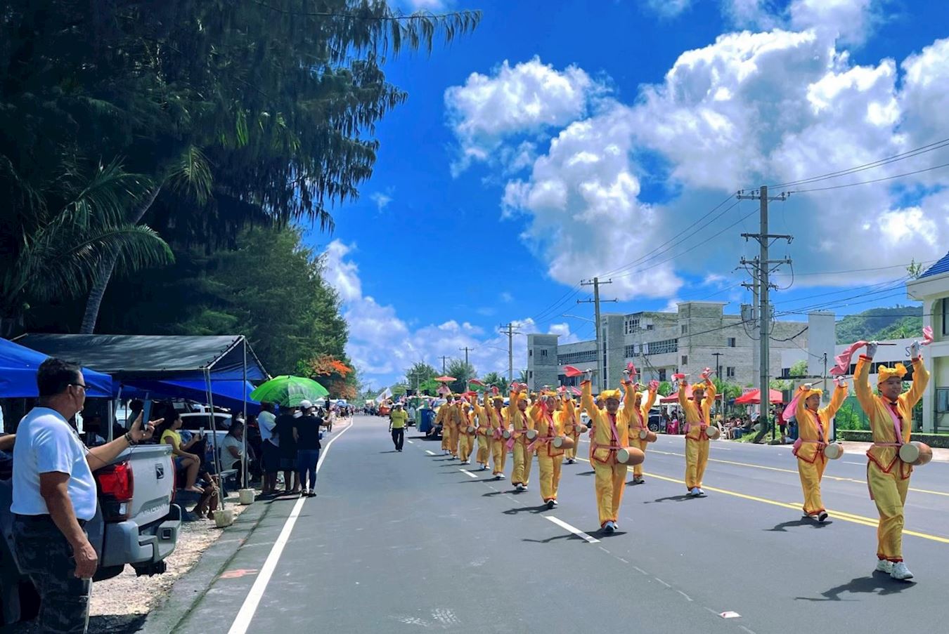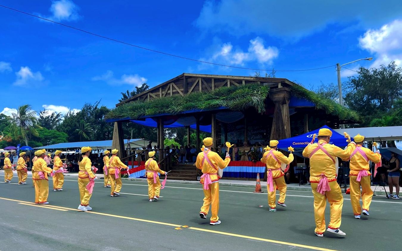 【明慧网二零二五年七月六日】二零二五年七月四日上午十时,四架美国空军战斗机从塞班岛天空飞过,塞班岛庆祝塞班解放日和美国独立日游行在喜庆的氛围中拉开帷幕,游行在苏苏比海滨路街道上盛大举行。塞班岛法轮功团体应邀参加了游行,亮丽的队伍和精彩的腰鼓表演深受观众喜爱。
