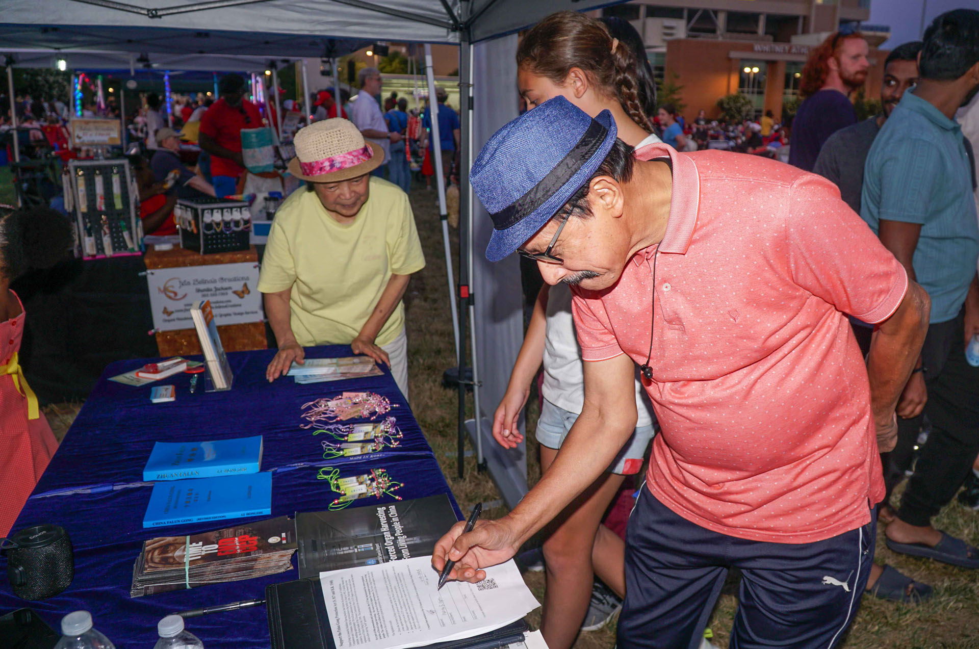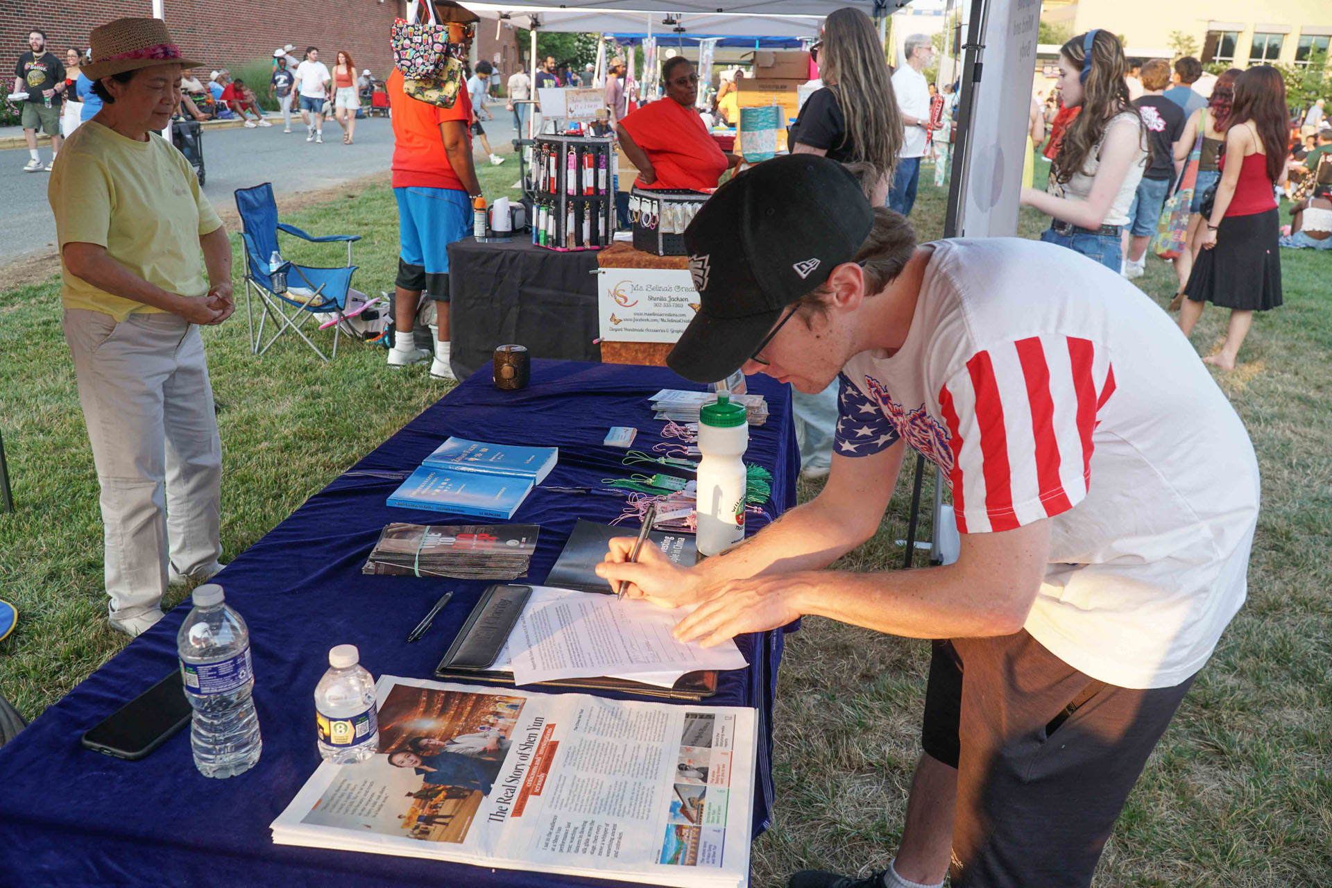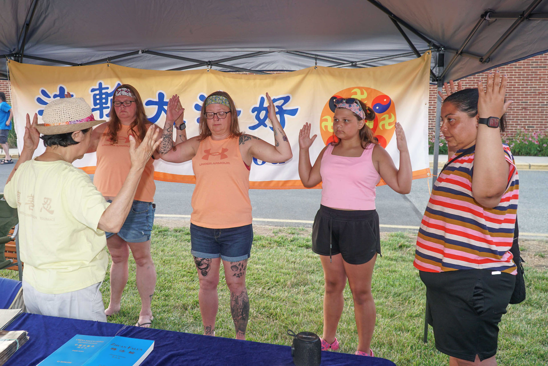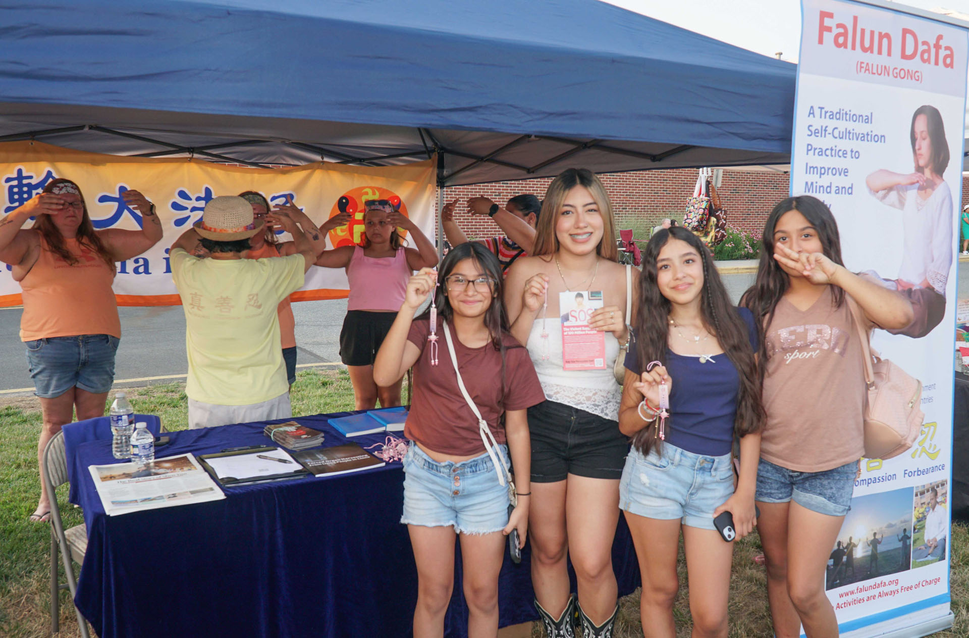 【明慧网二零二五年七月九日】二零二五年七月四日,特拉华州纽瓦克市(Newark, Delaware)举办了一年一度的美国独立日庆祝活动和烟花表演。晚上六点,在特拉华大学体育馆举办了三个小时的室外音乐会,并设立很多展位,吸引了上千人参加。法轮功学员的展位吸引了很多人前来关注和学炼法轮功。