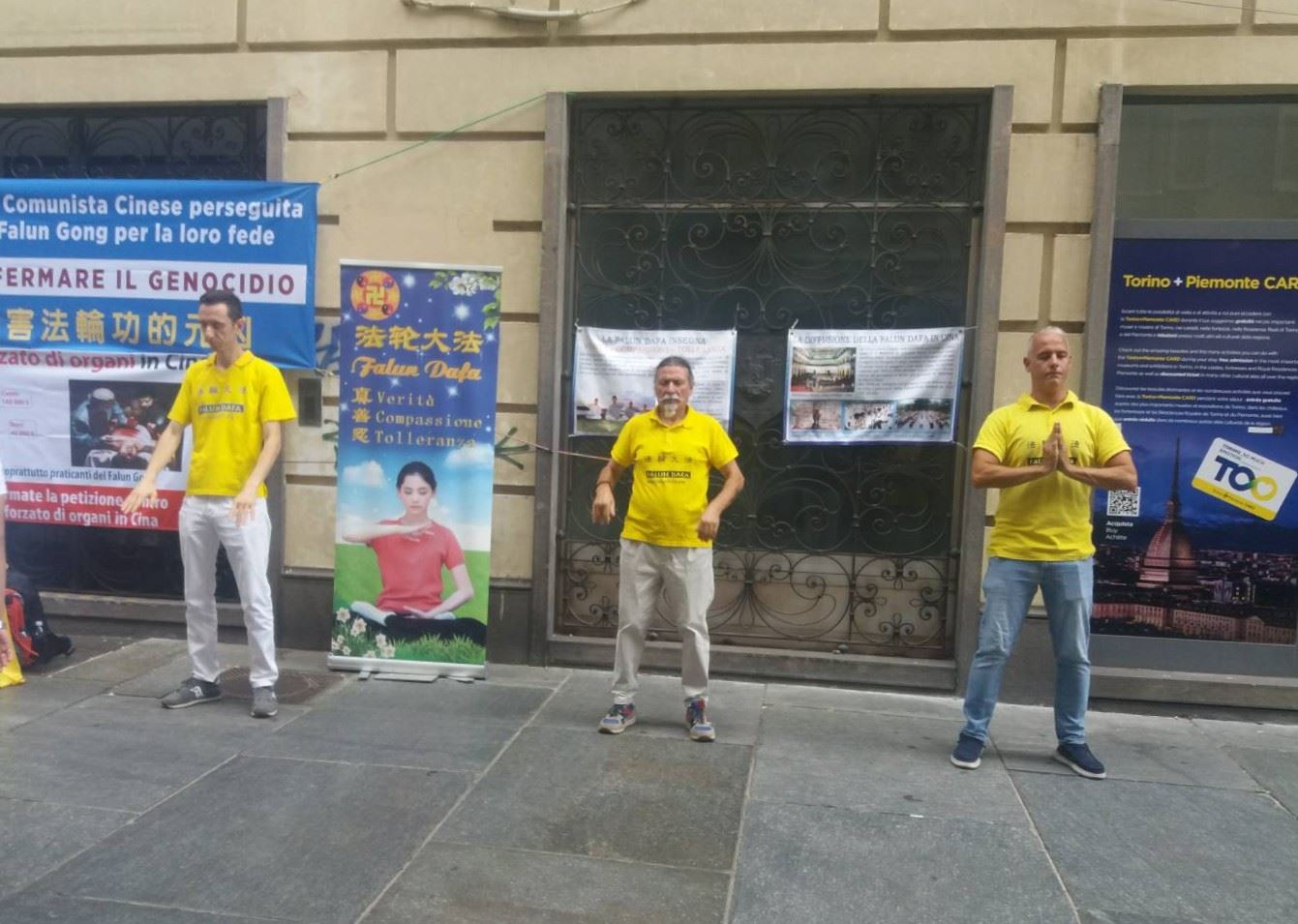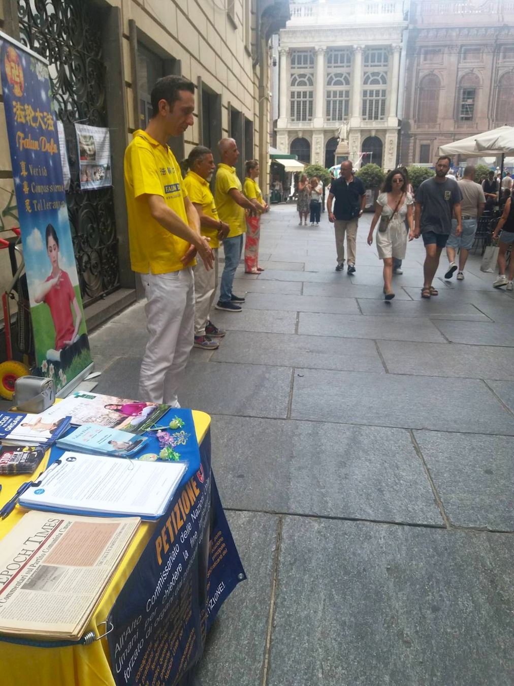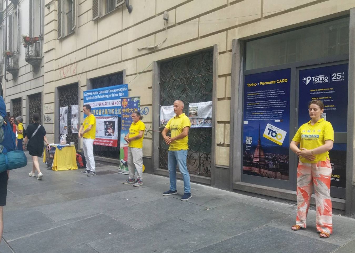 七月二十日星期日,皮埃蒙特Piemonte地区的法轮功学员在都灵市 Torino中心,举办揭露中共迫害法轮功罪行,呼吁民众共同制止迫害活动。
