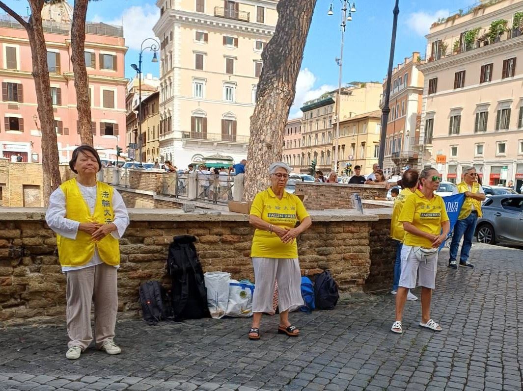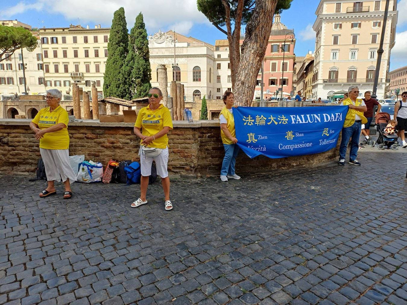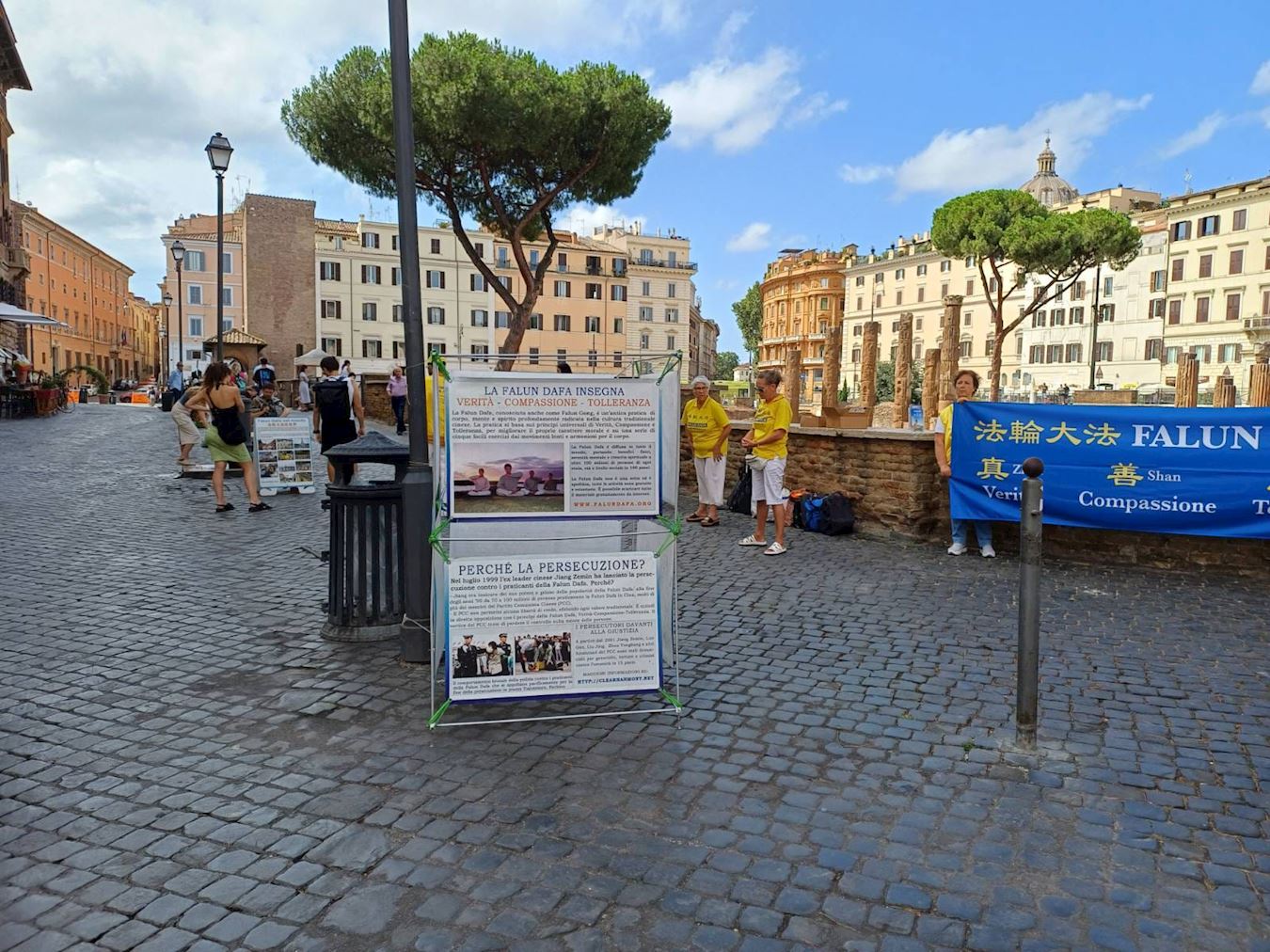 七月二十六日星期六,法轮功学员在罗马市中心的阿根廷广场(Largo di Torre Argentina)举行讲真相活动,吸引了许多路人的关注。通过展示功法和发放真相传单,学员向公众揭示了中国仍在持续的严重人权迫害,特别是针对法轮功学员的强制摘取器官等罪行。许多当地居民和游客驻足了解情况,并积极表达了支持与关心,有的人还签署了请愿书。