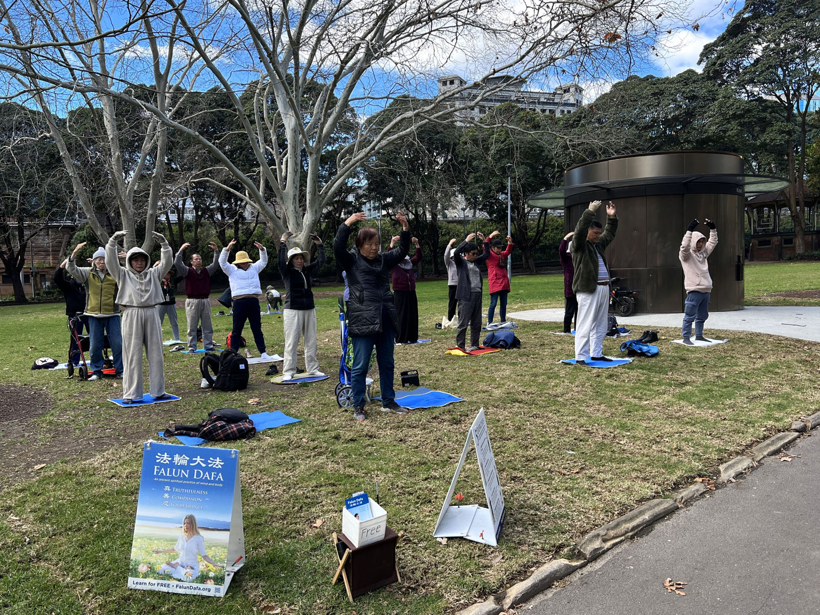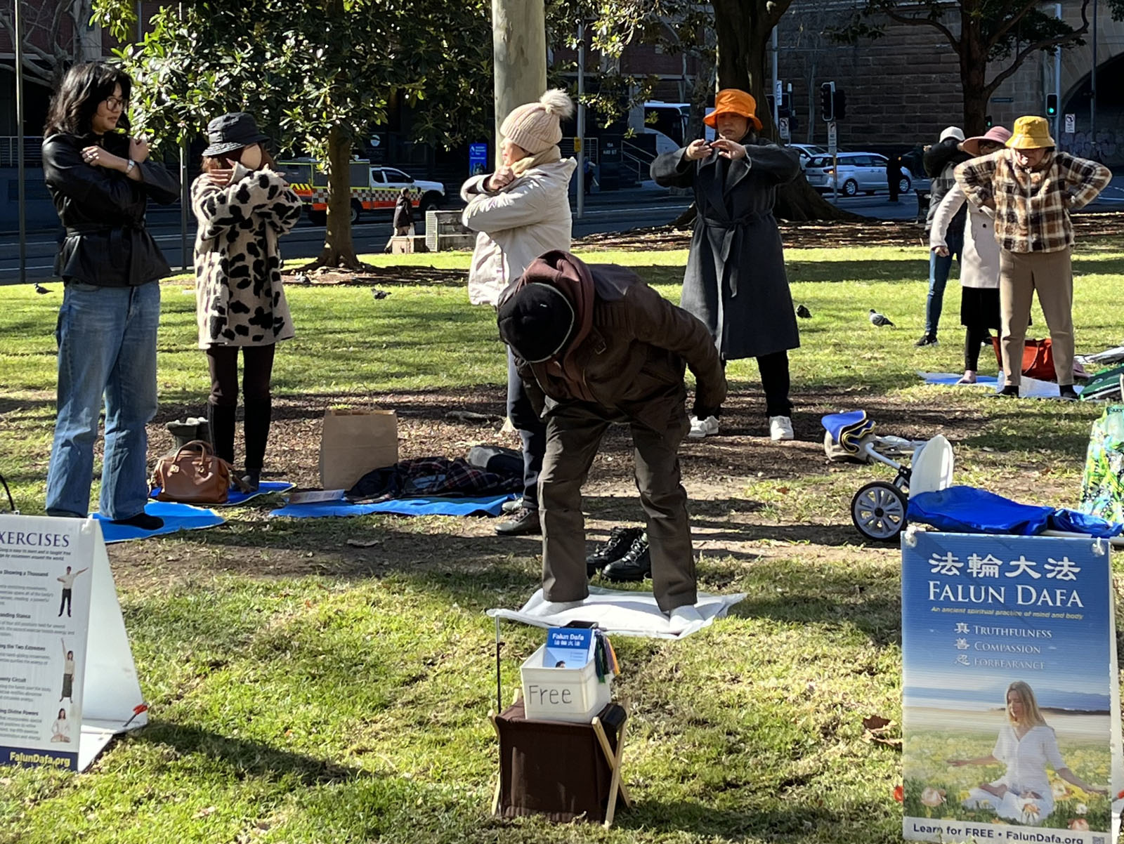 悉尼部分法轮功学员在贝尔穆尔公园演示和免费教授法轮功五套功法,每周一至周三,从上午十一点至下午一点二十分,不管严寒酷暑,他们从不间断,已坚持了好几年。