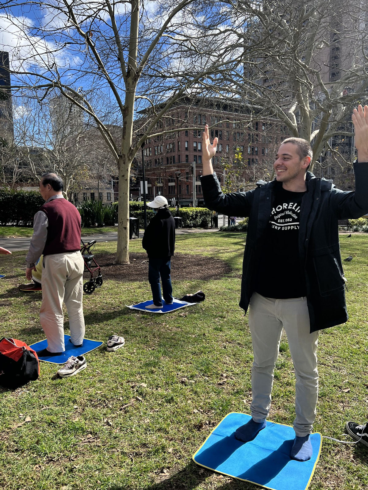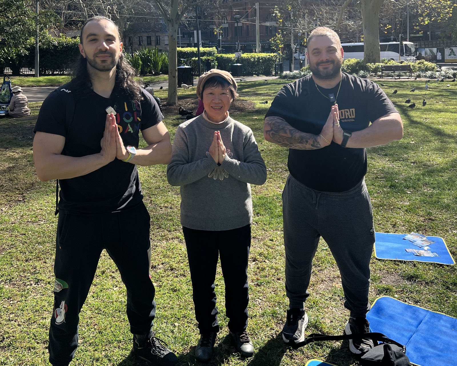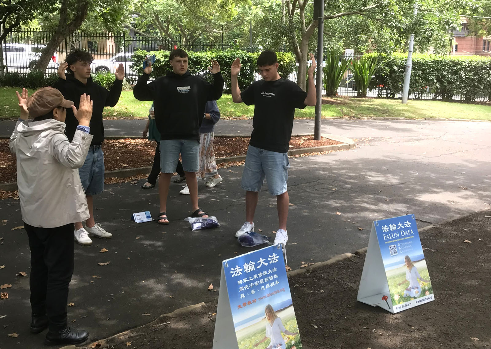 在悉尼冬天一个阳光灿烂的日子,有两位年轻的社交媒体制作人克里斯(Chris Savva)和马可(Marco Vitale)加入了法轮功学员的炼功行列。当学员询问这两位男士为什么来公园炼功时,他们说:“我们是从墨尔本来悉尼观看一个戏剧演出的,要去预定酒店。路过公园时,看到法轮功学员在炼功,场面看起来很平静祥和。而且看到你们给的传单上说炼法轮功可以增强体力。因为我早上的时候常常会感到疲倦,所以我们很有兴趣来体验一下。”