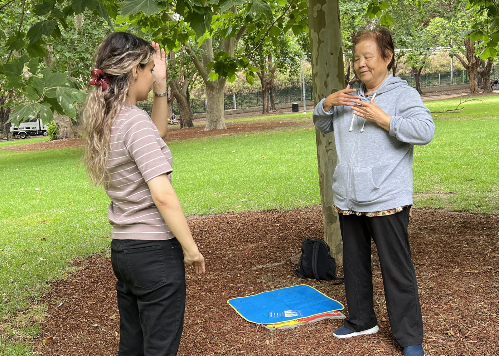 ![]() 图4:来自墨尔本的瑜伽教练塞西莉亚(左一)正在学炼法轮功。 |