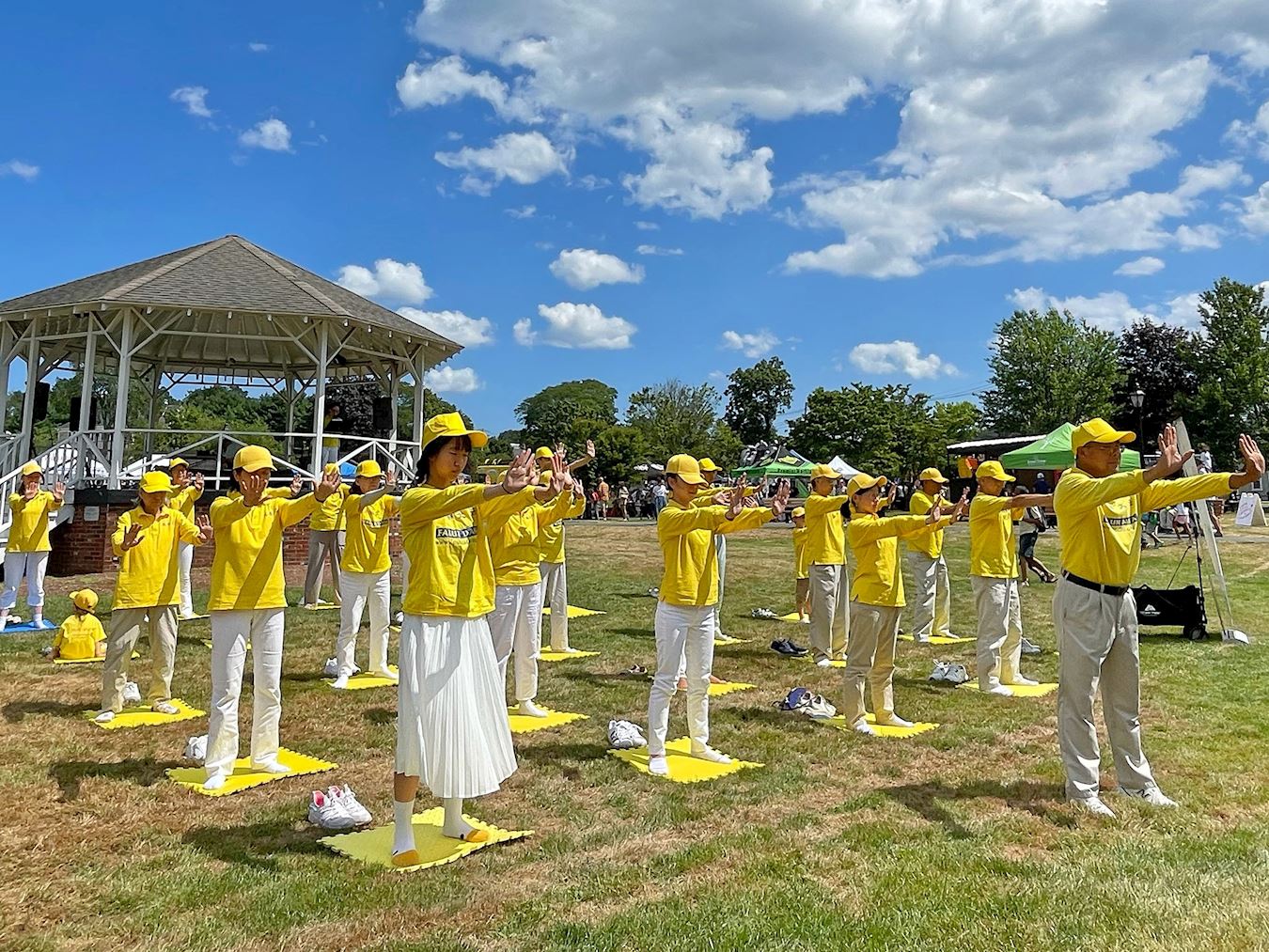 ![]() 图1~4:二零二五年八月二日,美国法轮功学员在波士顿城北伯灵顿举办的“欢庆伯灵顿”活动上展示法轮功功法,有游客现场学功。 |
