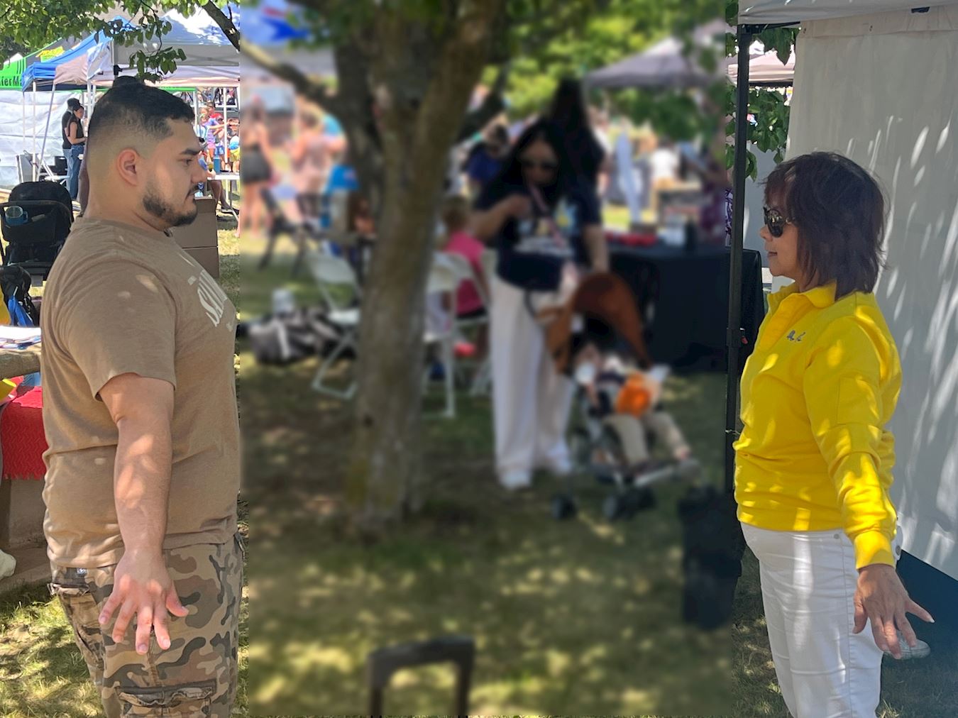 一位学员遇到一位西人中年男子,跟他讲述法轮功二十多年来被中共迫害真相,而且中共利用司法系统和海外媒体对法轮功和神韵进行跨国攻击和迫害。当得知学员在这里征集签名支持《法轮功保护法案》,这位男子向学员表示赞同和谢意,并拿了法轮功资料,同时还说:“希望你们今天能收到更多支持法轮功的签名”。