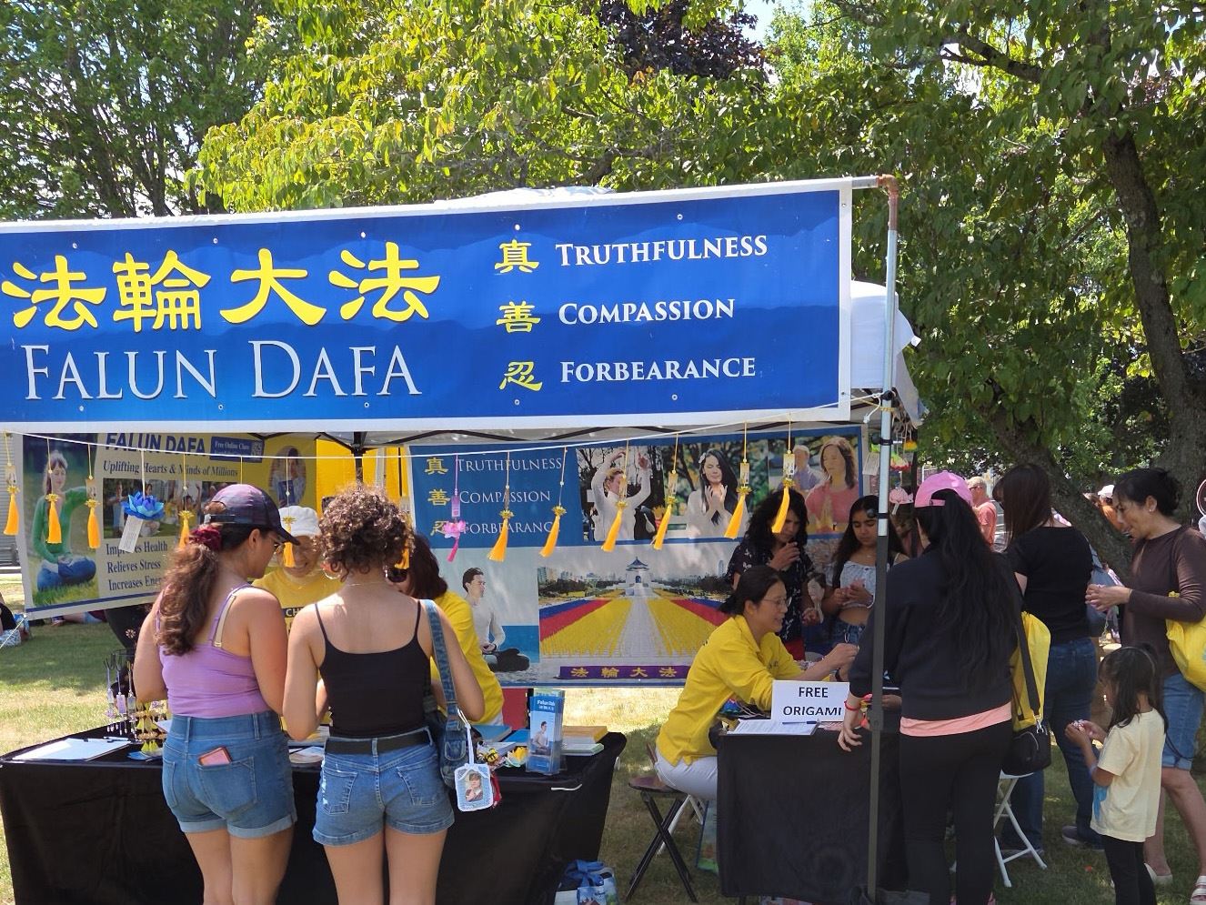 法轮功功法展示是这次主办方设立的节目之一。下午两点十五分,二十多位法轮功学员身着金黄色衣服,伴随着法轮功功法优美祥和的音乐,在市镇中心草坪上演示法轮功功法,游客纷纷驻足观看,有的坐在草坪上观看,有的坐在长椅上观看,有的跟随法轮功学员们的炼功动作模仿着炼。