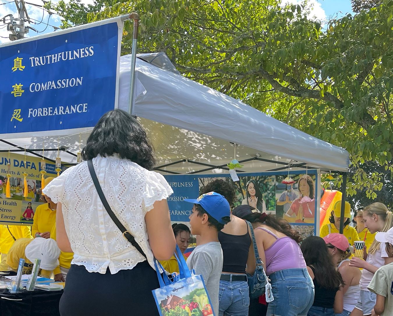 有两位华人老夫妇站在展位前方拍照。她对学员说,我知道你们是法轮功的,是好的功法。她犹豫了一下走到摊位上拿了法轮功简介资料,她说:“这是英文的,我看不懂。”学员就递给她一份中文的传单,她急忙的把传单收入袋内。学员回头取了一本《·九·评*共产党》送给她的先生,她先生非常高兴地把书收下了。学员感受到,这对夫妇长期受中共的宣传下,不敢接近法轮大法,今天终于有机会得到法轮功真相资料了。