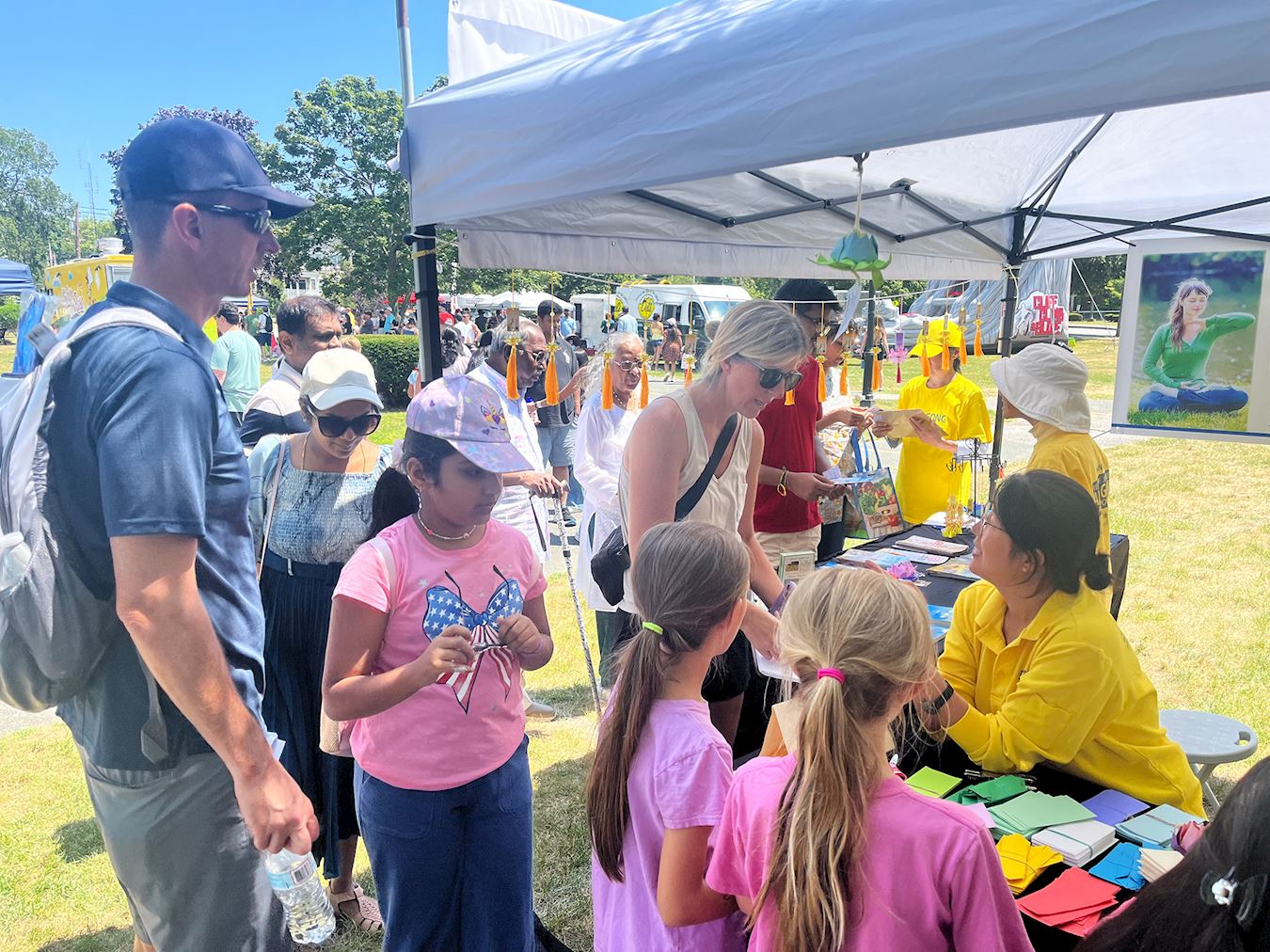![]() 图5~7:二零二五年八月二日美国麻州“欢庆伯灵顿”活动上,人们络绎不绝地前来法轮功的展位了解真相。 |