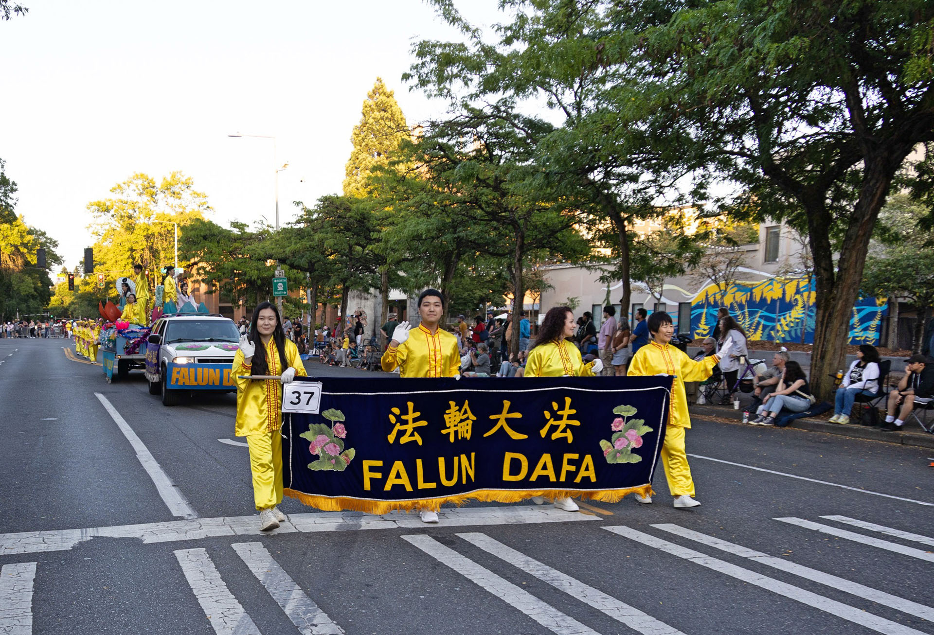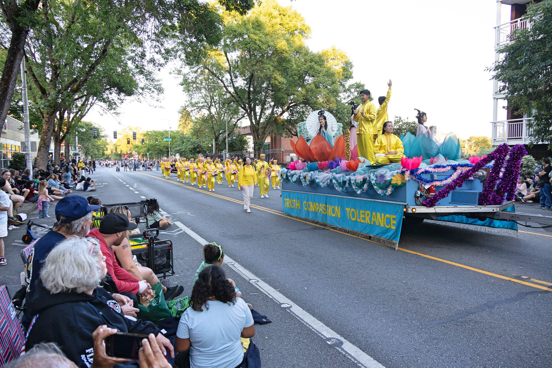 法轮功学员的花车装饰着祥云图样和美丽的各色花朵,在祥云和花丛中,学员们身着传统服装,展示着法轮功缓、慢、圆的五套功法,优美祥和的动作吸引了众多观众向学员们热情招手,赞叹不已。